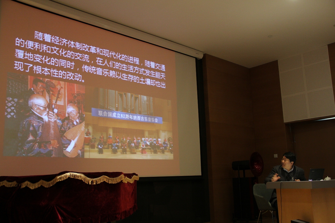 讲到90年代传统音乐的承续与危机时,靳院长指出随着交通的便利和文化的交流,在人们的生活方式发生翻天覆地变化的同时,传统音乐赖以生存的土壤也出现了根本性的改动。他为边远地区的人民大众,尤其是年轻人对本地区、本民族音乐的热爱程度趋于弱化这一现象感到惋惜。面对这一现状,靳院长指出当今国家及全国各地都出台了相应政策,为保护传统音乐做出了积极有效的努力。