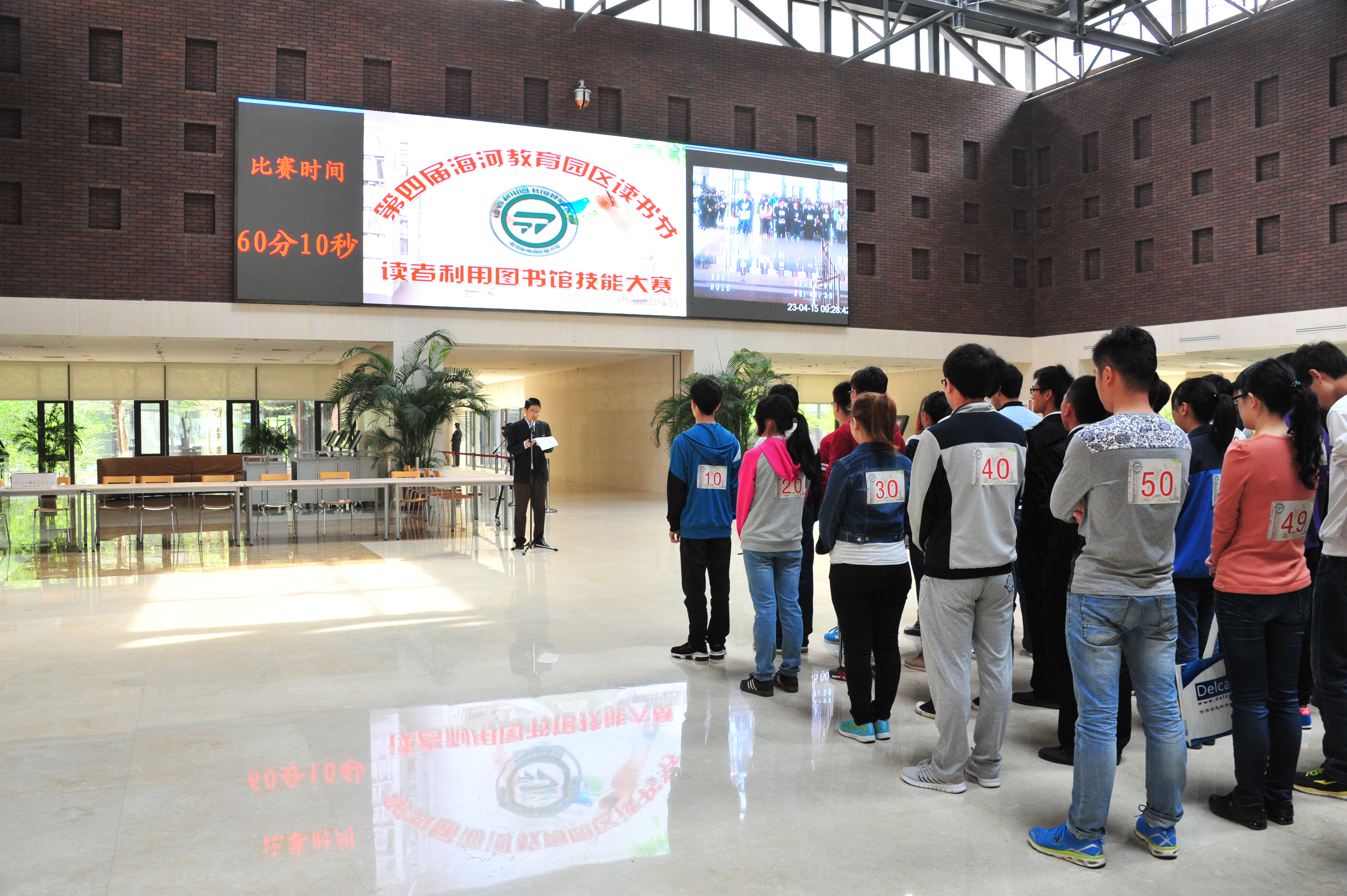为纪念 “世界读书日”,推动全民阅读的社会风尚,丰富社区居民及园区师生的文化生活,天津图书馆海河教育园区图书馆会同海河教育园区管委会、津南区文化广播电视局于4月23日举办了“读者利用图书馆技能大赛”活动。别开生面、内容风趣的技能大赛吸引了140余名选手参加。海河教育园区管委会教育发展处、天津图书馆、津南区图书馆的主要负责人出席了活动,园区院校的数百名师生及社区居民观看了大赛,为参赛选手加油助威。