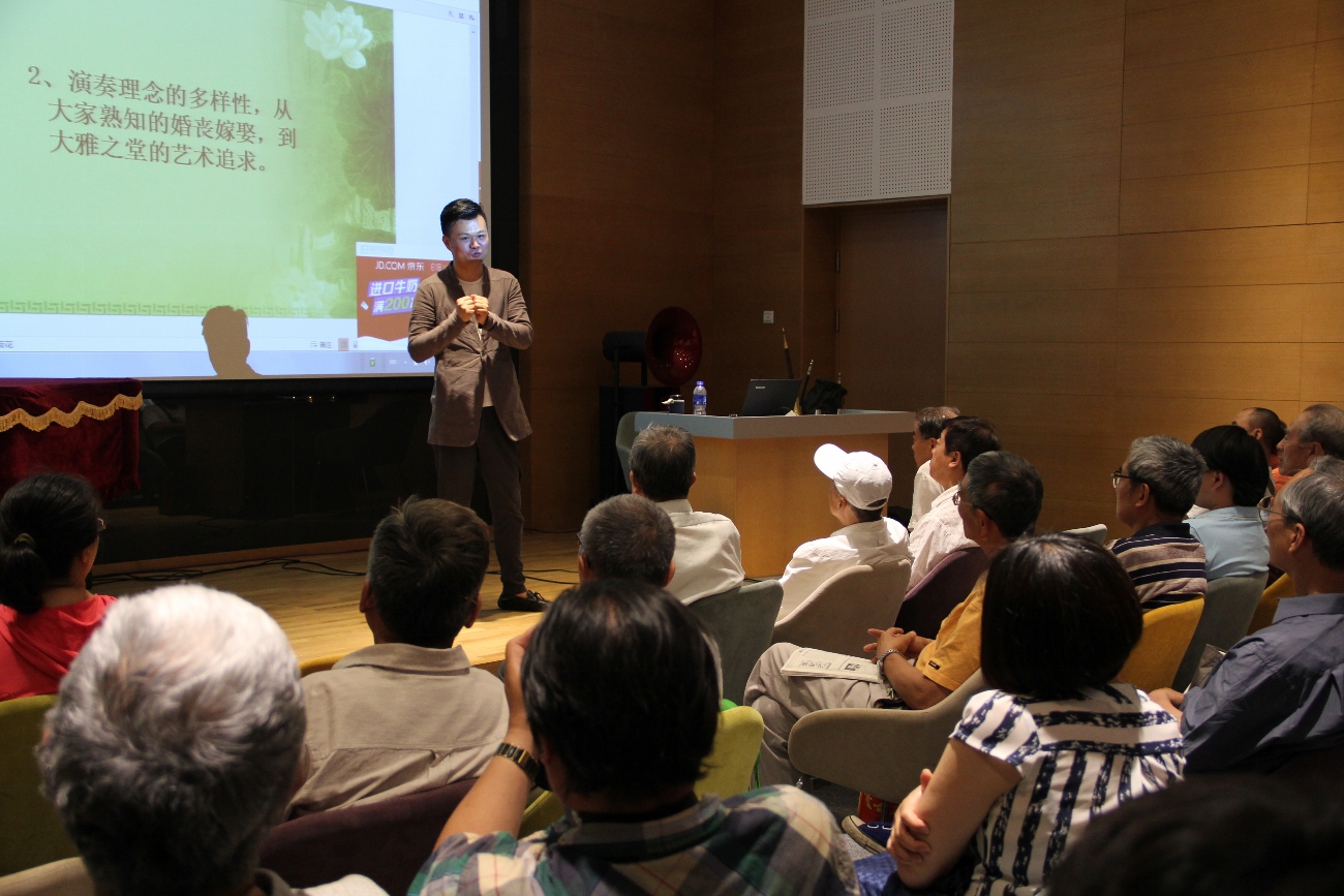 接下来,在王老师的引领下,读者们分别欣赏了《全家福》、《关中情》、《十八板》、《大笛绞》、《弦上秧歌》等各具特色的唢呐独奏曲或由唢呐领奏的管弦乐乐曲片段。讲到唢呐演奏新形势的探索时,王老师说,在现代生活中,唢呐可以承担不同的角色,如有些摇滚乐队、电声乐队中也会加入唢呐元素,在一些影视配乐中,也会使用唢呐独奏来推动音乐情绪。唢呐的演奏理念,从大家熟知的婚丧嫁娶,发展到对大雅之堂的艺术追求上了。唢呐音色从乐曲《百鸟朝凤》中的自然音色模仿,到追求声声动情的情感音色。