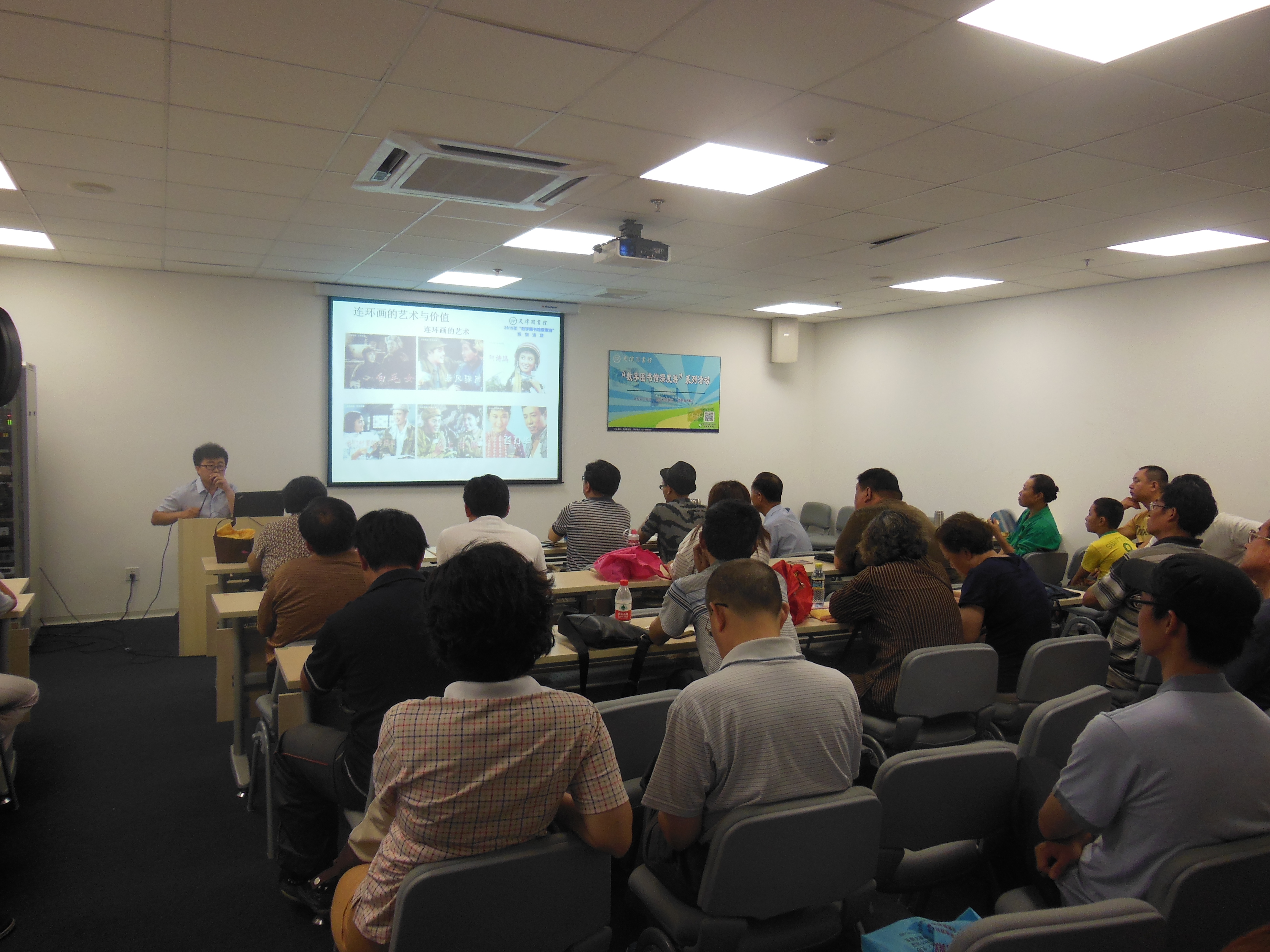 6月21日上午正值中国传统端午佳节来临之际,天津图书馆文化中心馆四楼多媒体演示室举办了两场“数字图书馆深度游”系列读者培训:分别为“连环图画 恒星永耀------中华连环画史话”和“由点及面-构词法学英文”。这两场讲座异常火爆,读者们早早地赶到现场,将上半年“数字图书馆深度游”活动推向了高潮。