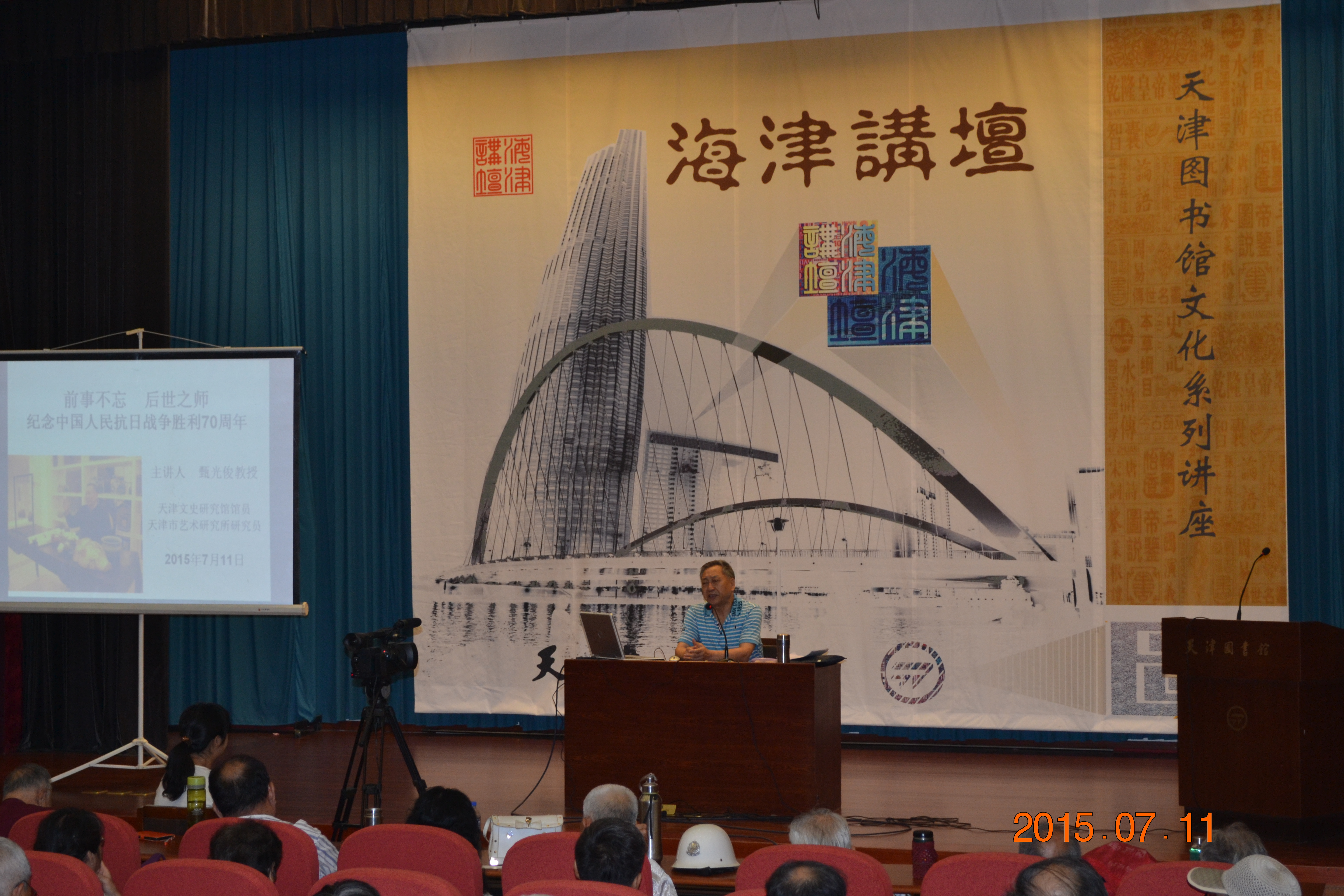《海津讲坛》第321讲于2015年7月11日上午在天津图书馆复康路馆报告厅如期举行。天津市文史研究馆馆员、天津市艺术研究所研究员甄光俊老师应邀担任本次讲座的主讲嘉宾,为到场读者讲述“前事不忘,后事之师--纪念中国人民抗日战争胜利70周年”。