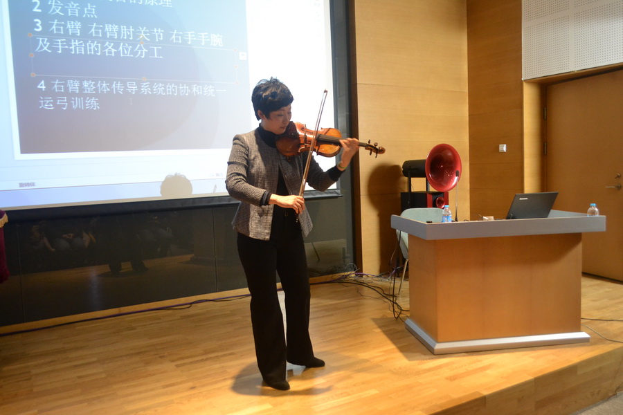 唐老师在讲到“声音的色彩”时,说到四点技巧即:一、右手运弓技巧:发音点的选择,右手力度的运用,右手运弓速度的变化。二、左手的相关技巧:起落指的力度选择,手指着陆点的变化,颤指丰富多彩的变化与技巧。三、左手,右 手综合统一的力度演奏,力度可以不相统一的演奏方法。四、演奏状态中的自然而多变的肢体语言能够从视觉上更好地支持演奏技艺产生的实际音效。结合这四点技巧唐老师为大家分别示范。