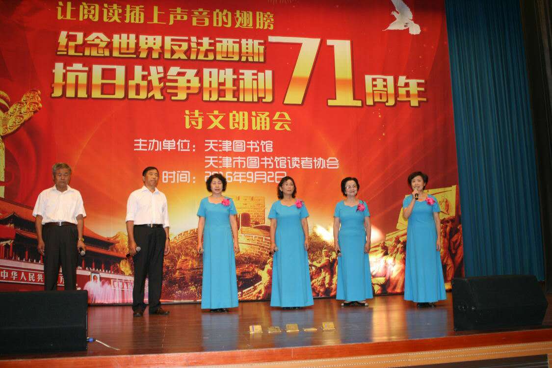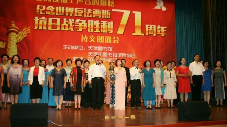 今年九月三日是我国抗战胜利七十一周年纪念日。天津图书馆、天津市图书馆读者协会于九月二日在天津市图书馆举办了《纪念世界反法西斯、抗日战争胜利七十一周年诗文朗诵会》。