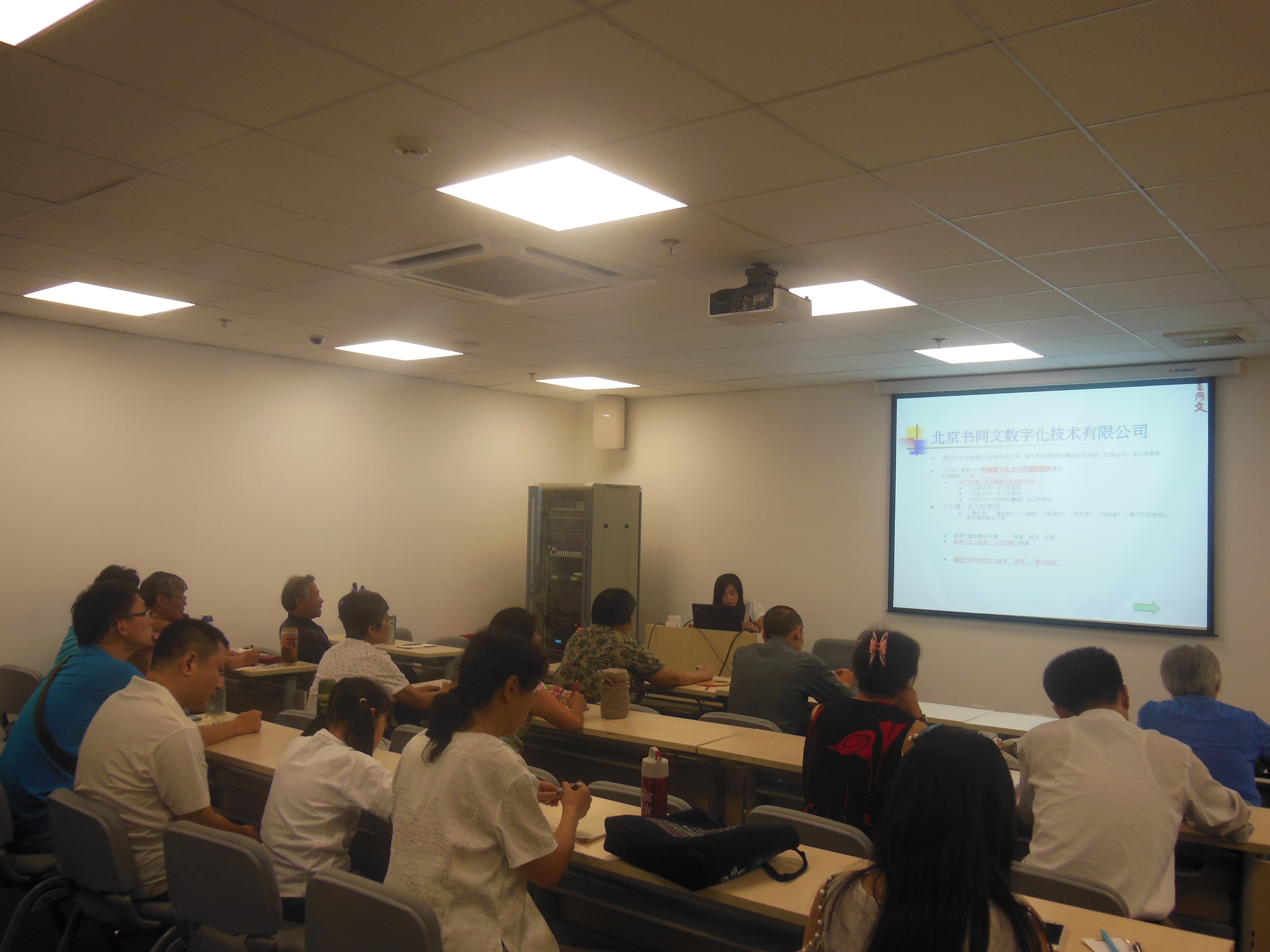 接下来的第二场讲座,特邀北京书同文数字化技术有限公司韩美娇讲师讲授。此次以古籍为主题的讲座吸引了大量古籍爱好者前来参加。讲座中,韩老师首先介绍了书同文公司的简介和发展历程;古籍数字化过程的详细讲解。接下来,韩老师给读者朋友们以“大明实录”为例介绍了书同文公司主要产品和产品功能。最后,韩老师向读者演示了“在线体验——书同文草书”、“书同文彩书”、在线制作图章等应用,充分调动了大家的兴趣。