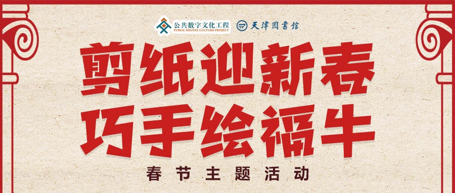 剪纸艺术作为世界级非物质文化遗产与中华民族庆祝新年的特色方式,蕴含了丰富的历史性、文化性、艺术性。为推动非遗传承,喜迎辛丑到来,天津图书馆(天津市少年儿童图书馆)举办“剪纸迎新春·巧手绘福牛”春节主题活动。在积极推动非遗保护传承,促进中华民族优秀传统文化发展的同时,邀请广大读者以剪纸艺术的形式在喜庆热闹的气氛中迎接新年的到来。