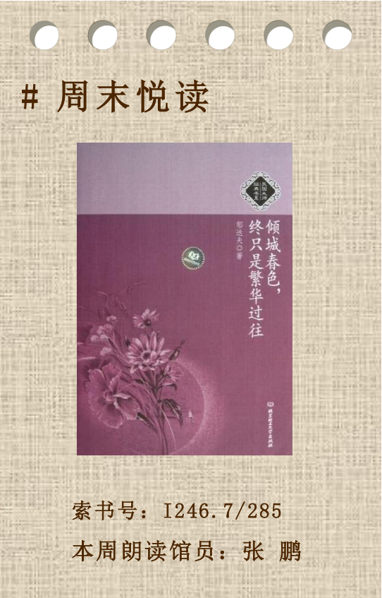 《倾城春色,终只是繁华过往》收录了郁达夫先生的《秋柳》《秋河》《春风沉醉的晚上》等经典文章,此次朗读内容节选自《故都的秋》一篇,“爱国”是此篇的主旋律。愿书声与您同在,伴您领略作者对美的追求和对祖国的热爱。
