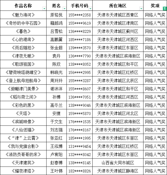 本着展现津门旅游资源和文化内涵,用镜头为天津“存档”的原则,经过专家多维度、全视角评审,共评选出一等奖5名、二等奖10名、三等奖20名,此外通过网络人气点赞排行,评选出网络人气奖30名。