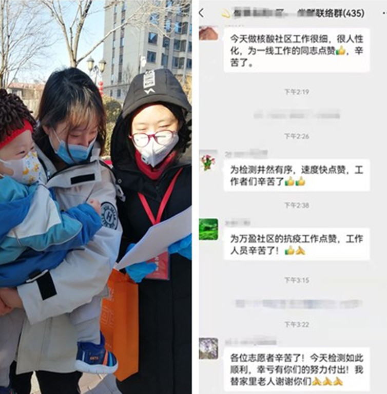 图1.综合办公室职工张丽敏所住区域为管控区,她第一时间报名参加社区志愿服务,1月8日凌晨1点便开始了核酸检测通知和预约登记工作。在三轮核酸检测过程中,高效完成了25层100户居民的检测组织任务。