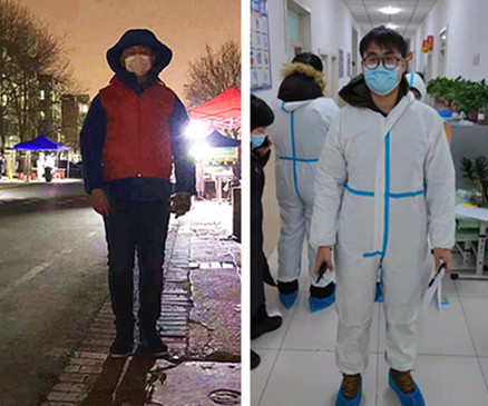 图4.党务人事部职工陈界(左)协助社区完成核酸检测点筹备和检测现场秩序维护工作后留影。安全保障部职工张可旺(右)在核酸检测点手动登记检测人信息9小时后留影。
