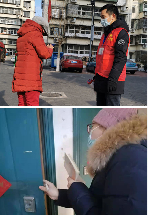 图8.图书借阅部职工劳有盛(上)在社区核酸检测现场维持秩序,解答居民提问。报刊借阅部职工李萌(下)正在挨家挨户通知核酸检测时间、地点和注意事项。