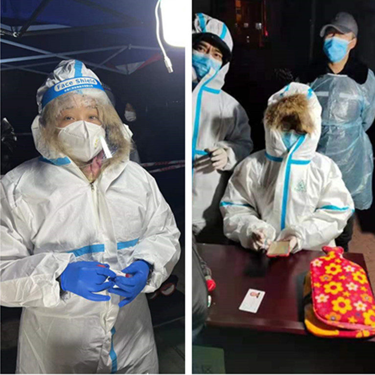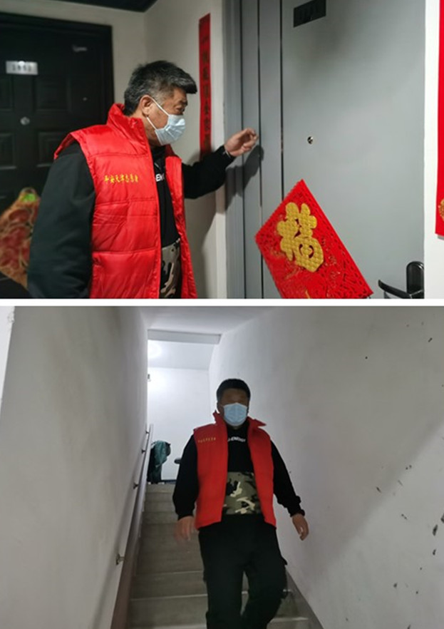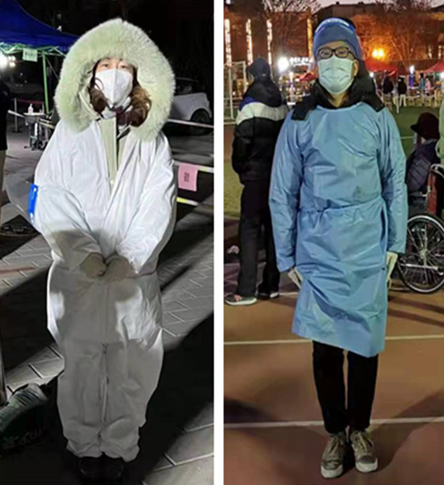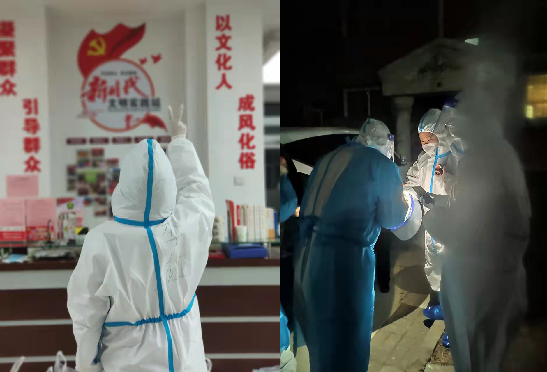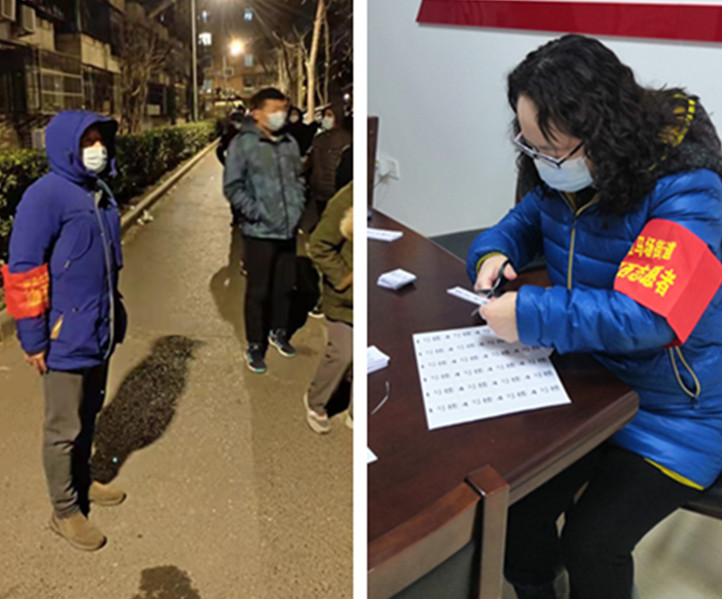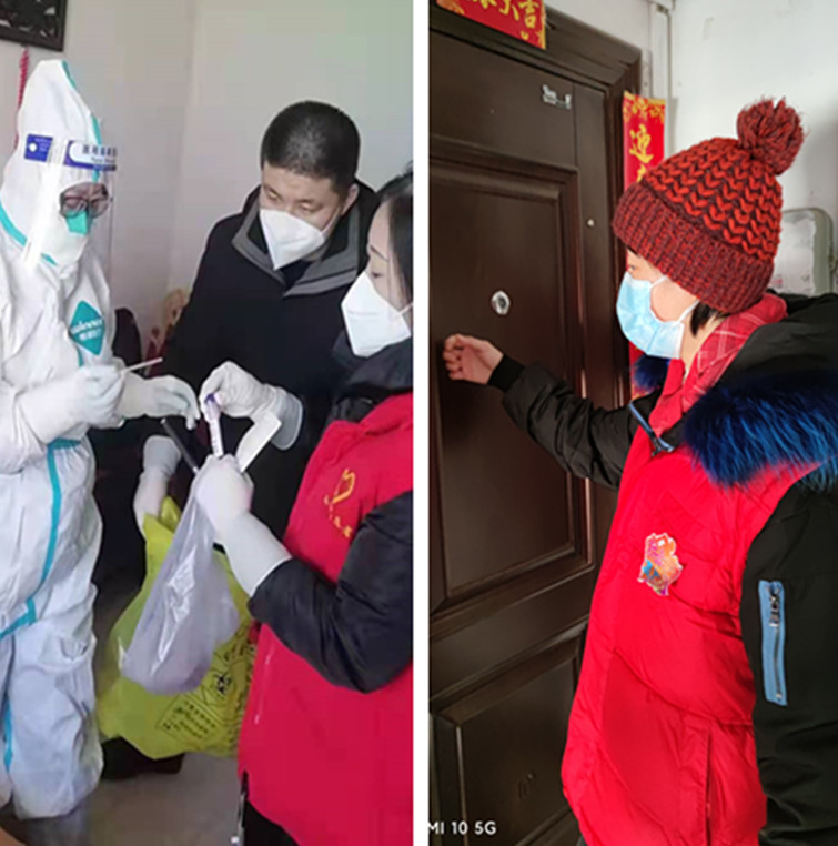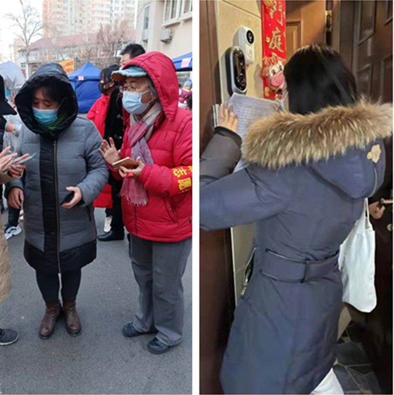 图5.系统资源部职工刘轶(左)随社区书记共同协助医务人员入户,为行动不便的老人和孕妇进行核酸采样。采访编目部职工丛莹(右)走访310余户居民,确认核酸检测情况。
