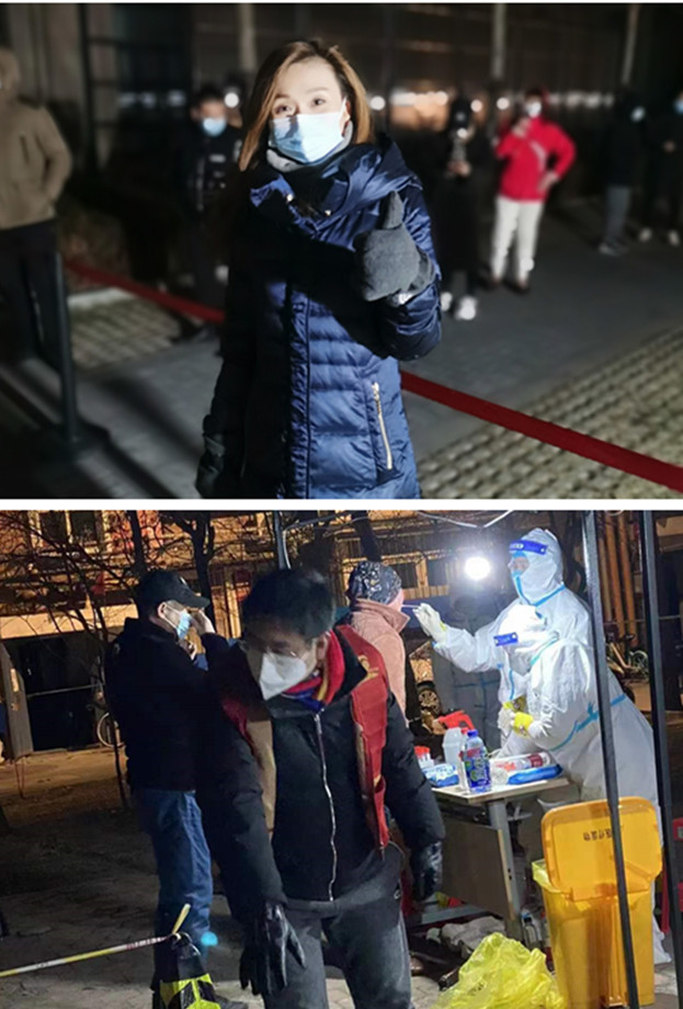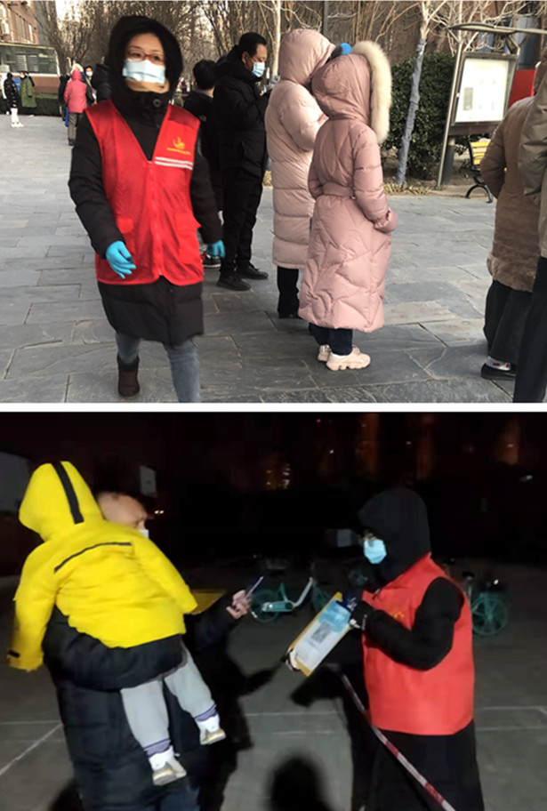 图8.阅读推广部职工耿蓓(上)和党务人事部副主任刘冰(下)在社区核酸筛查中,负责检测现场布置、群众组织、问题解答和秩序维护等工作。