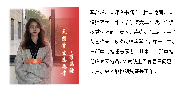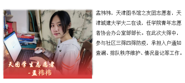 1月8日,奥密克戎突袭津城,父老乡亲同舟共济、奋力迎战。在与病毒赛跑的关键时刻,作为当代大学生,我深感责无旁贷,义不容辞投身于防疫抗疫志愿工作中。