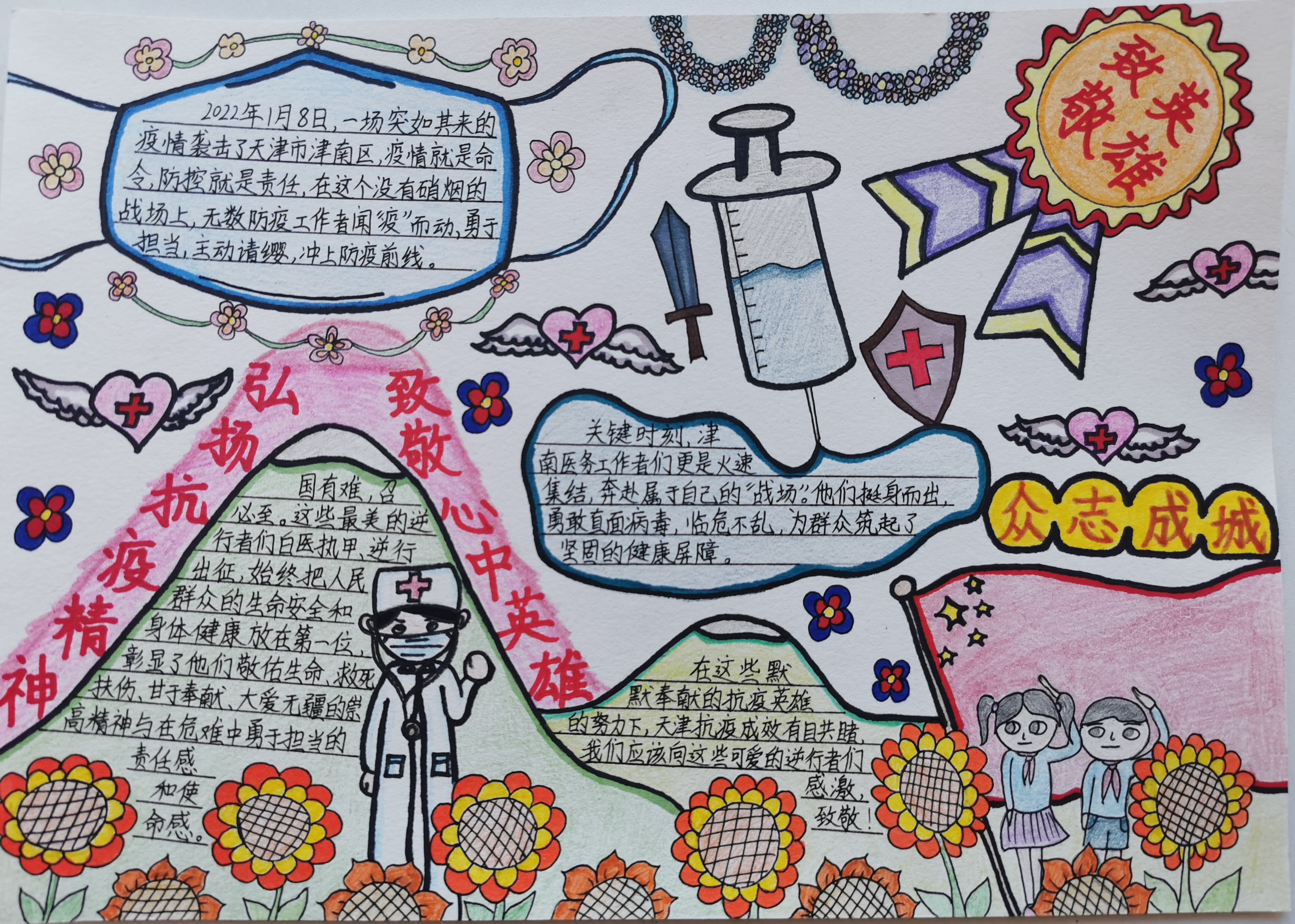 冬寒有尽,春意正暖。在硬刚“奥密克戎”的天津行动中,海河儿女用众志成城筑起坚固防线,全力以赴打赢这场疫情防控的硬仗。为铭记特殊记“疫”、礼赞抗疫英雄、弘扬伟大抗疫精神,1月26日起,天津图书馆(天津市少年儿童图书馆)联合天津广播电视台经济广播共同开展“弘扬抗疫精神 致敬心中英雄”作品征集有奖展示活动,面向广大读者及听众朋友广泛征集征文、摄影、书画、微视频、手抄报等形式的天津抗疫主题作品。 活动启动以来,社会各界人士踊跃投稿,用细腻的镜头记录下大筛战场的点点滴滴,用生动的笔触刻画出寒夜抗疫的感人画面,用真挚的文字抒写下直击人心的动人篇章。一件件作品,凝结着真实真诚的心灵情感,展现着人间大爱的炽热情怀,保存着极不平凡的时代记忆,更凝聚起面向未来的无限力量。 从本期起,我们将陆续选取优秀作品进行展播,敬请欣赏。
