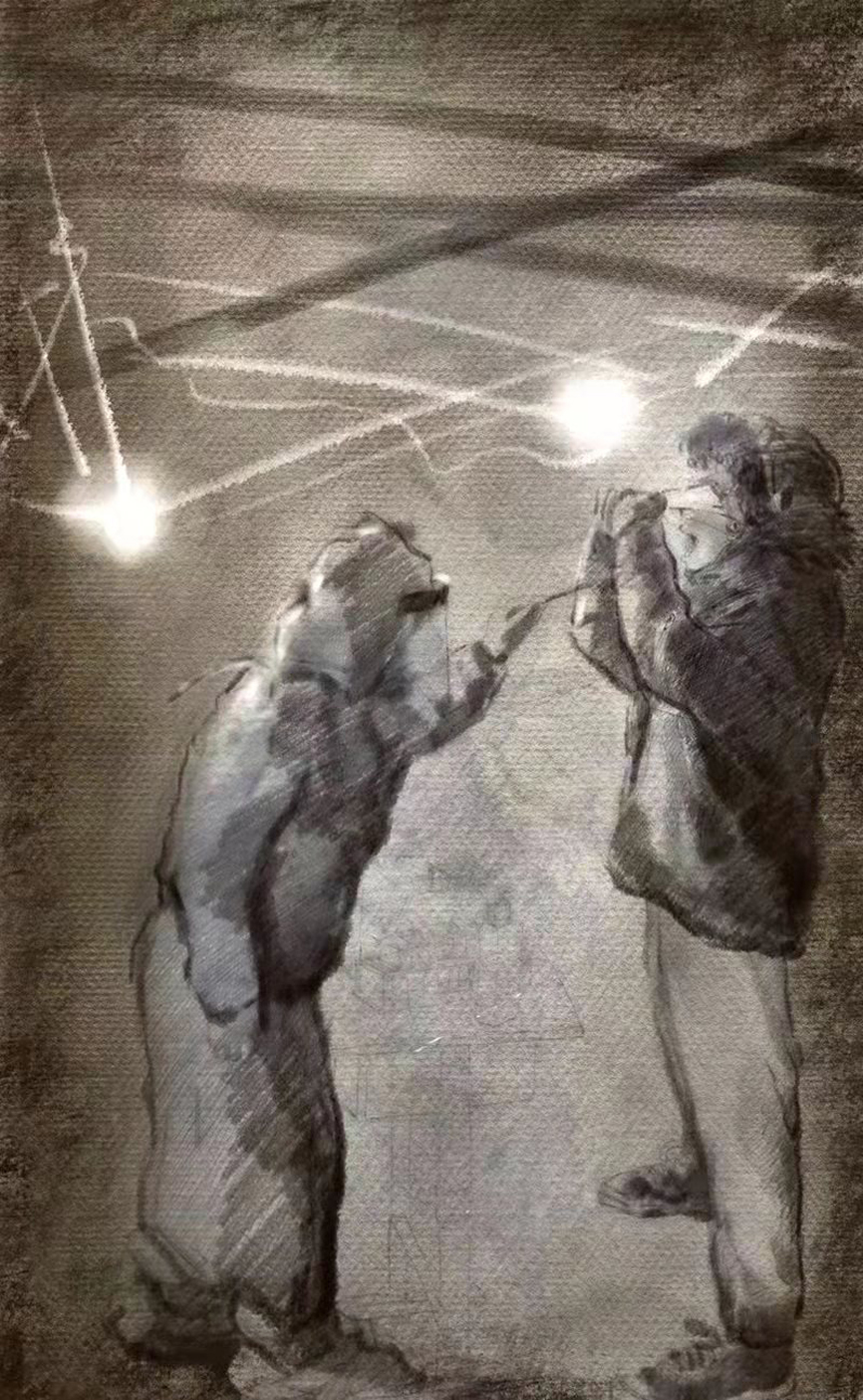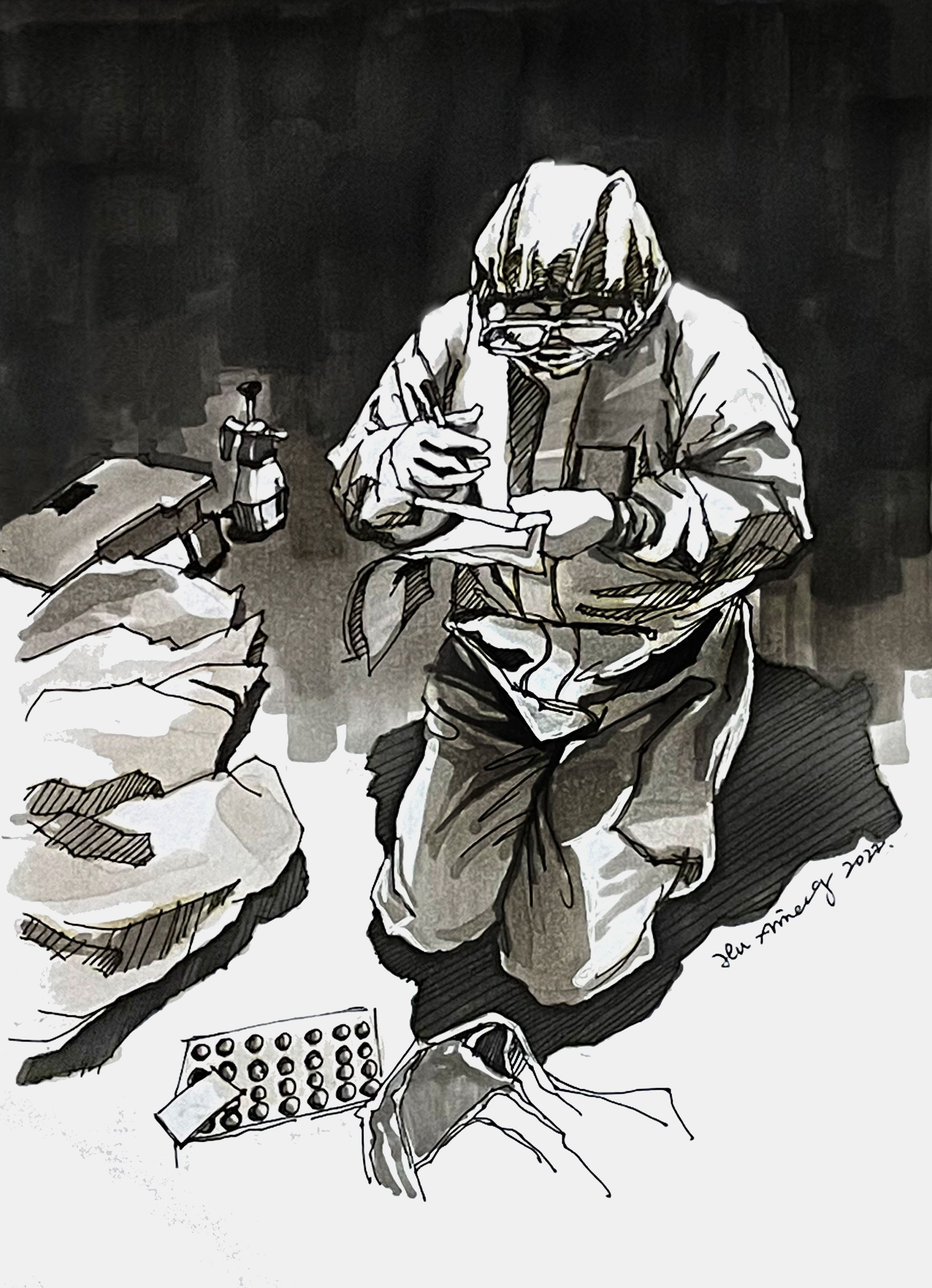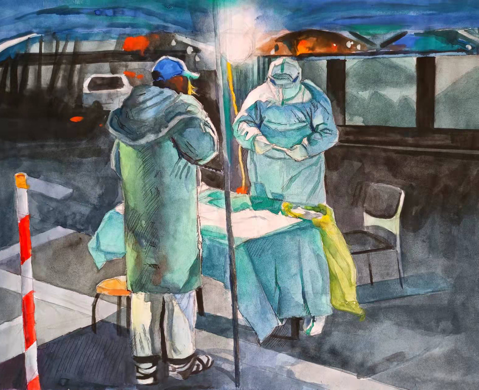 在这里,一身白衣就是我们的武装。大家一旦穿上就不舍得脱掉,因为我们深知穿脱的不易,深知这件衣服的意义。冬天的黑夜格外寒冷,胶皮手套中紧贴的手指早已无法弯曲,下意识摆出的V字手势仿佛在告诉自己,胜利指日可待。面罩外的世界是如此的婀娜多姿,点点星光在雾气的映射下,显得格外耀眼。也许是液化的作用,一条条冰凉的小虫从下巴滑到脖子,最后聚集在衣领,我用舌试探性地舔了一下面前的N95,确定是水珠后放心地低下了头,这时才感受到衣领已被浸湿。
