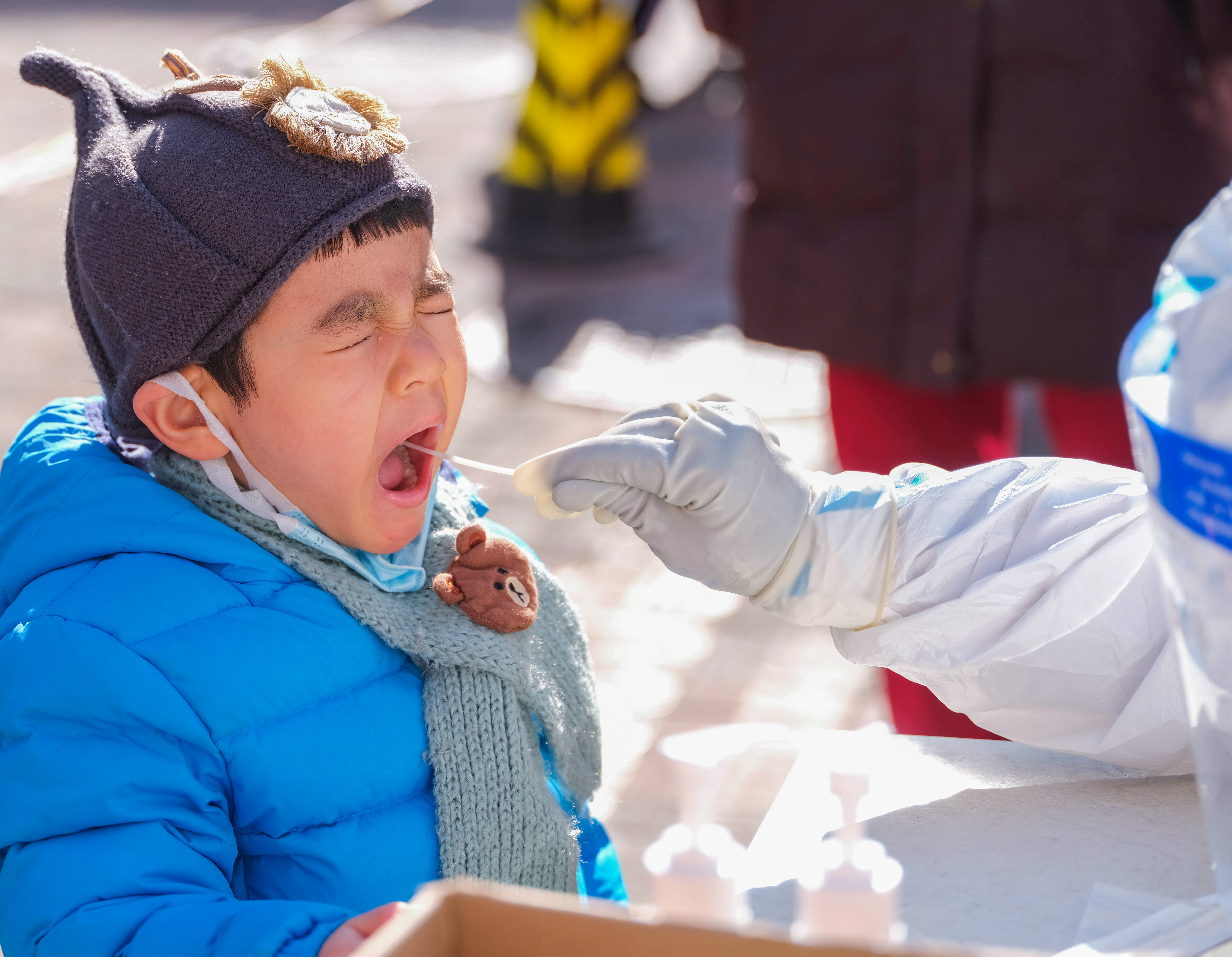 与上厕所的不便不相上下的是,在露天广场一站就是至少6小时以上的采样。正值腊月严冬,寒风凛冽。每个居民采样后,刘大夫都需用免洗手消再次消毒。虽然带着医用手套,但也挡不住和室外气温一样寒冷的手消液,在每一寸皮肤上剥夺着温度。