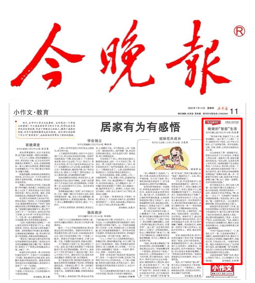 本版展示的优秀征文作品《姥姥的“智能”生活》来源于《今晚报》2022年7月14日的“小作文”专刊,读者可点击下发链接进行阅读。