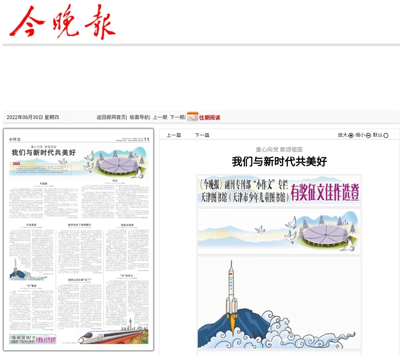 本版展示的8篇优秀作品来源于《今晚报》2022年6月30日的“小作文”专刊,分别为《升国旗》《问天》《天宫课堂》《姥爷学会了视频聊天》《预备志愿者》《“云”看病》《高铁让回乡路“近了”》《“车”纳百川》。读者可点击下方链接进行阅读。