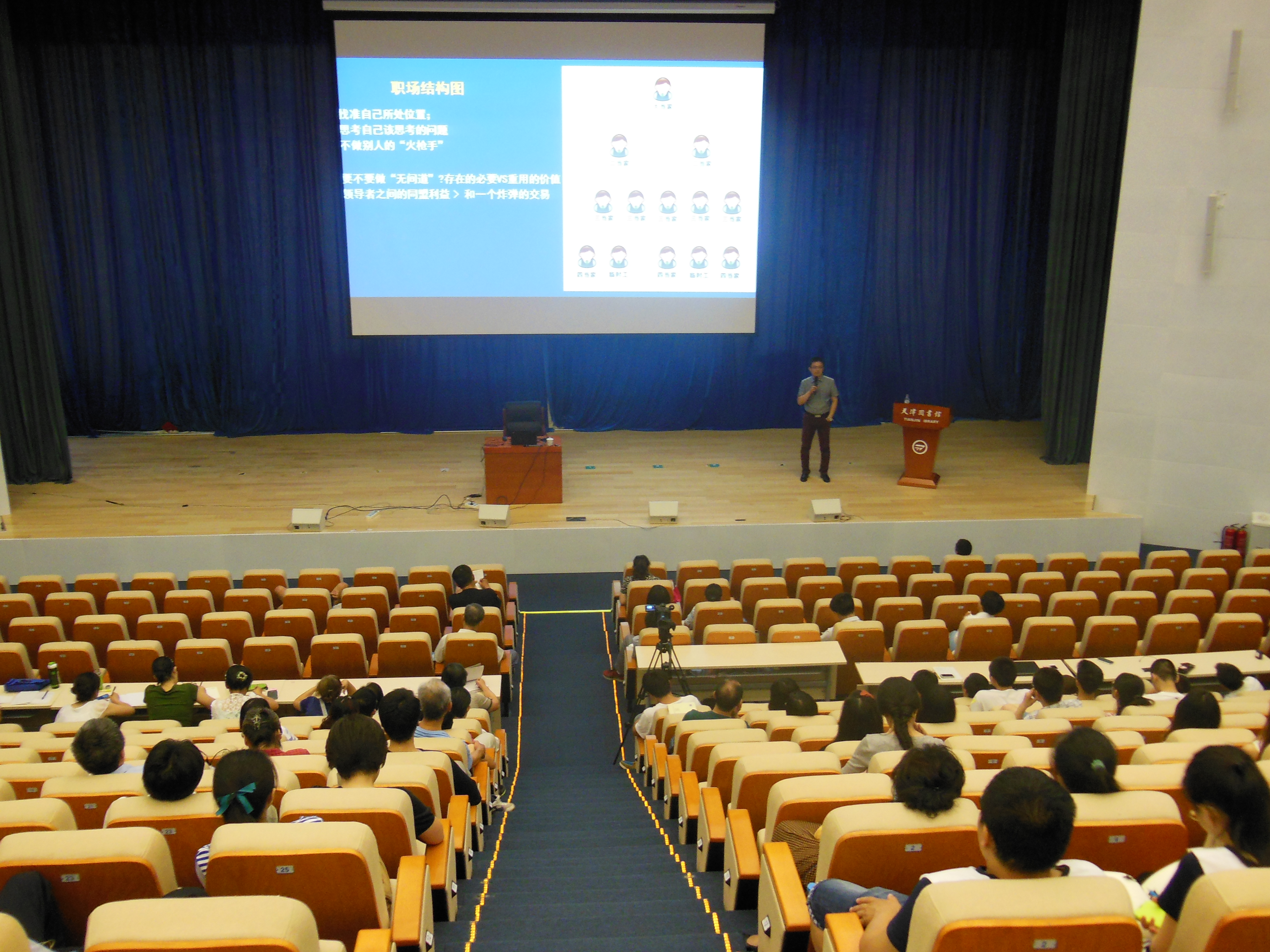 张老师从自己的亲身经历谈起,丰富的职场经验贯穿其中,他从计算机专业本科生到人力资源部,从招聘培训到网络课程软件销售,再到销售负责人兼讲师,看似不相干的工作,其实都是他为职业理想在做积累,每一步都是恰到好处,而且每一跳都很成功。整场讲座,大鹏老师始终站着进行演说,激情四射,气氛热烈而活跃,不仅为处于当今严峻就业形势中的朋友们剖析了职业的规划、职场的困惑以及职业的发展,而且指明了今后努力的方向,使自己拥有更强的竞争力!