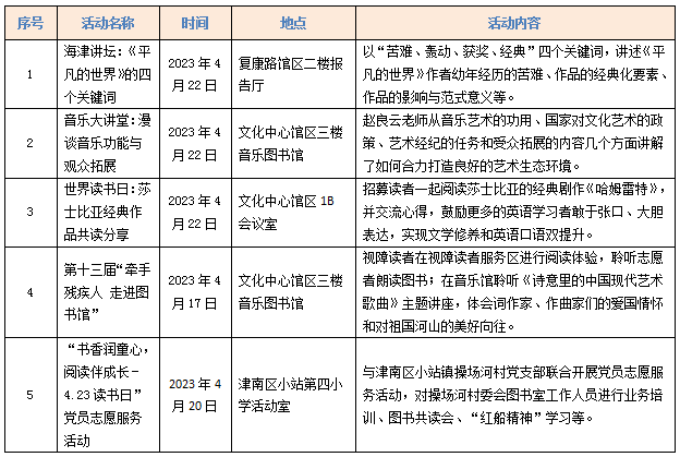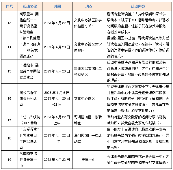 明媚春光暖,草木向阳青。为了让广大读者享受美好的阅读盛宴,在2023年世界读书日来临之际,天津图书馆精心策划推出以“‘悦’读相伴 书香致远”为主题的阅之享、阅之声、阅之趣、阅之美、阅之展五大板块26场活动。活动以助推全民阅读为基点,着力树立新阅读理念,聚焦打造全民阅读服务网,提供体系化、均等化、社会化、精品化的喜闻乐见的活动形式,开拓全民阅读新局面。