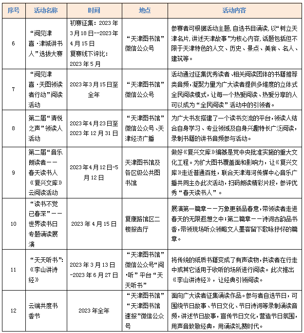 声音,可以传播文字,可以传递思想;声音,可以寄托情感,可以传承精神;声音可以把阅读表达的淋漓尽致,声音可以遇见更好的自己。为引导读者做阅读的响应者、感召着、实践者,天津图书馆策划开展系列诵读活动。由市文旅局主办,天津图书馆承办,喜马拉雅城市文化天津频道协办的“阅见津喜·津城讲书人”选拔大赛和“阅见津喜·天图领读者行动”阅读活动,打造城市重要文化IP,让每一个热爱阅读、热爱分享的人可以成为“全民阅读”活动中的引领者。联合天津广播电视台经济广播开展第二届“清悦之声”领读人活动,领读者录制书籍的讲书音频参与活动,通过专家选拔,优秀领读者将走进天津经济广播《清悦之声》读书专栏分享自己的阅读感悟。联合天津海河传媒中心音乐广播共同主办第二届“音乐朗读者——春天读书人《复兴文库》云阅读活动”,扫码朗读精彩片段,参评优秀“春天读书人”。经典诵读志愿服务团队推出“读书不觉已春深——世界读书日专题诵读展演”,展示美文佳作和阅读的魅力。天津图书馆微信公众号“阅·听”平台“天天听书”推出《李山讲诗经》,让经典引领阅读,让传统成为时尚,让国学点亮4·23世界读书日。“云端共度书香节”活动征集诵读作品,让书香浸润心灵,用阅读照亮内心,优秀作品将进行线上展播。