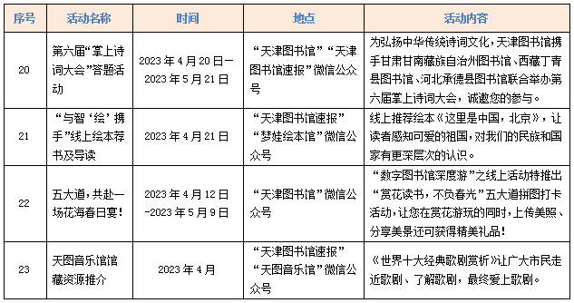 博览群书,开卷有益。阅读很美好,温暖了岁月,点亮了哲思。阅读是泉,有滋养;阅读是星,予力量;阅读是纸,是成长;阅读是种,会萌发;阅读是智,是促进。天津图书馆精选好书,向您推荐。邀您一起,沐春色,沁书香。为弘扬中华传统诗词文化,天津图书馆携手甘肃甘南藏族自治州图书馆、西藏丁青县图书馆、河北承德县图书馆联合举办第六届掌上诗词大会。“与智‘绘’携手”线上绘本荐书及导读,《这里是中国,北京》让读者感知可爱的祖国,对我们的民族和国家有更深层次的认识。“数字图书馆深度游”之线上活动特推出“赏花读书,不负春光”五大道拼图打卡活动,让您在赏花游玩的同时,上传美照、分享美景天图音乐馆馆藏资源推介,《世界十大经典歌剧赏析》让广大市民走近歌剧、了解歌剧,最终爱上歌剧。