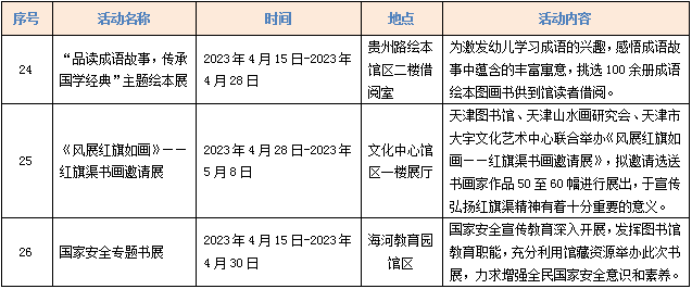 阅读是一棵树,一片浓荫可以让人遮阳避暑;阅读是一根长长的线,让风筝在天空翱翔。它让鸟鸣唱、筑巢;让花团锦簇,果实累累;让千秋傲立,成为沧海桑田的见证。阅读的价值需要展示。世界读书日期间,天津图书馆梦娃绘本馆举办“品读成语故事,传承国学经典”主题绘本展,精心挑选100余册成语绘本图画书,让小读者在阅读中增长文学知识,让阅读成为儿童智慧启蒙中必不可缺的方式。联合天津山水画研究会、天津市大宇文化艺术中心举办《风展红旗如画——红旗渠书画邀请展》,邀请选送书画家作品进行展出,对于宣传弘扬红旗渠精神有着十分重要的意义。为推动国家安全宣传教育深入开展,发挥图书馆教育职能,充分利用馆藏资源,在海河教育园馆区举办国家安全专题书展。