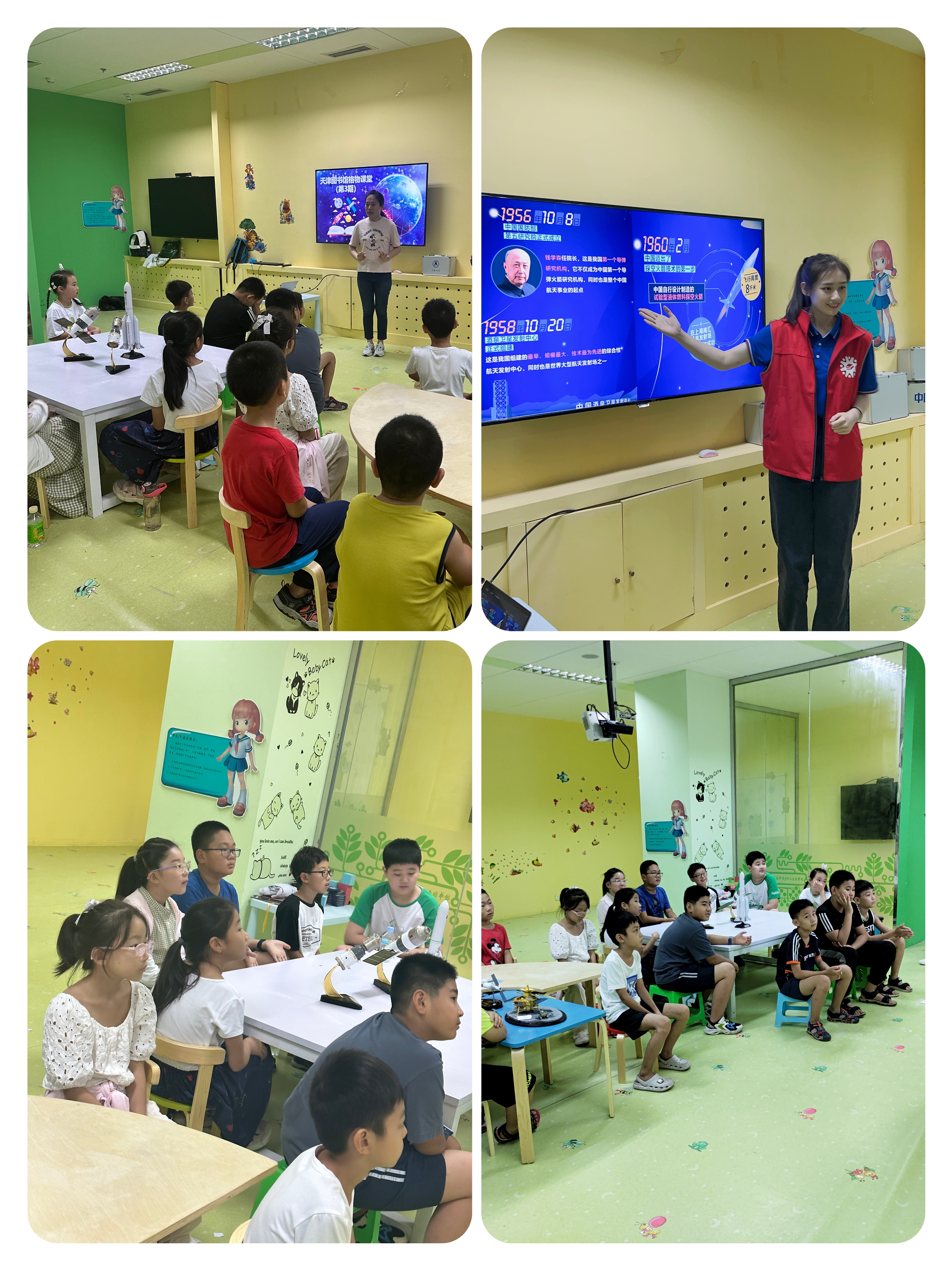 活动开始由天津图书馆工作人员进行简单的暖场,讲解了格物课堂活动的目的和意义。随后由哈尔滨工业大学的志愿者高淼淼为小朋友们讲述了我国航空航天的发展史,介绍了我国如何从迈出航天事业的第一步到载人飞行、探月、最终成为拥有自己的卫星导航系统和空间站的航天大国。现场小朋友们也基于已有的科学知识积累表达了自己对我国航天科技的认识和看法,现场气氛活跃,学习氛围浓厚。