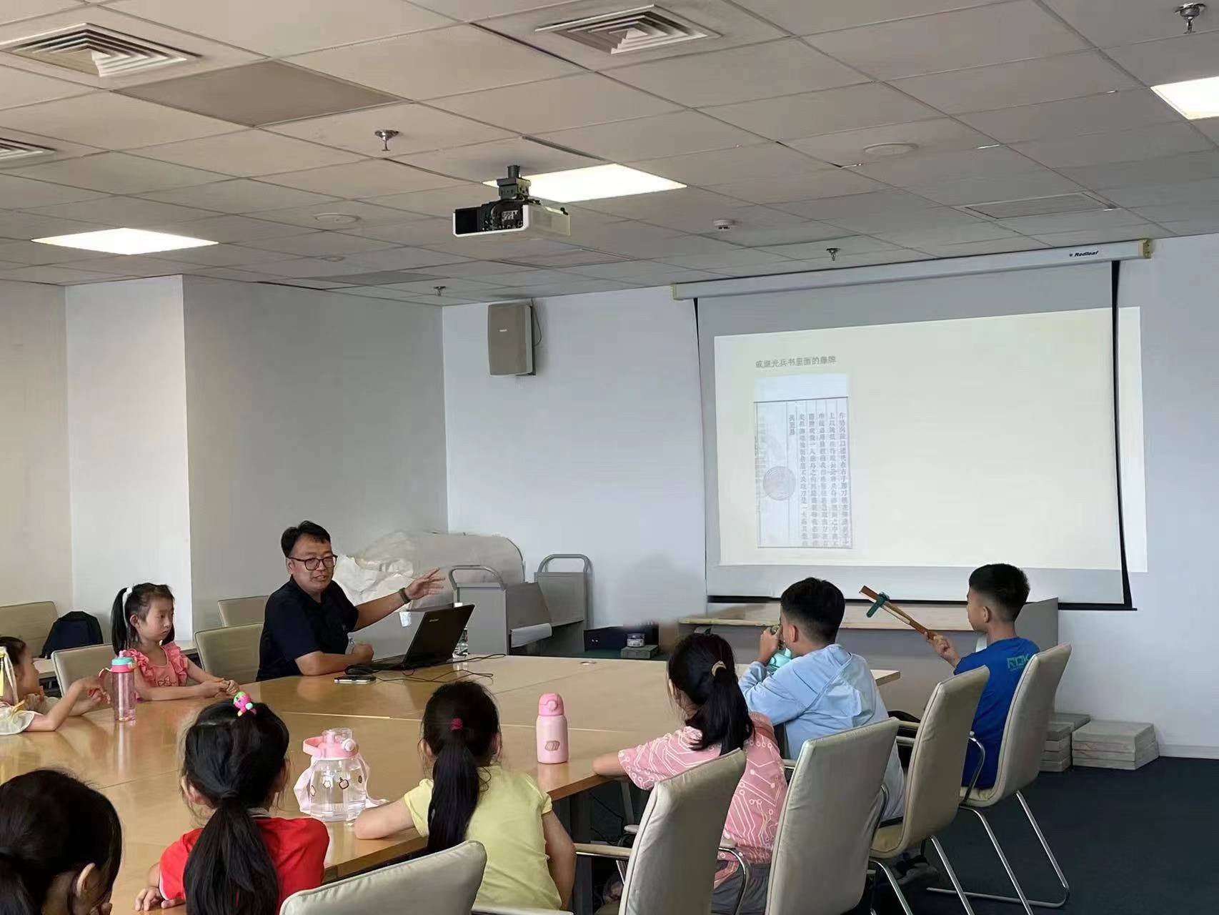 随后,天津图书馆青年业务骨干王泓杰以《古籍装帧形式的演变——四眼线装体验》为题,对古籍装帧的相关知识进行了深入浅出的讲解,介绍了“竹简”“丝帛”“纸张”等古籍的载体以及“蝴蝶装”“包背装”“线装”等古籍装帧方式,带领参与活动的小读者进行“四眼线装”的古籍装帧体验。孩子们亲自动手,为古籍进行装订、锁线、贴书签,亲身体验到了古人如何进行书籍装订与保护,收获满满。