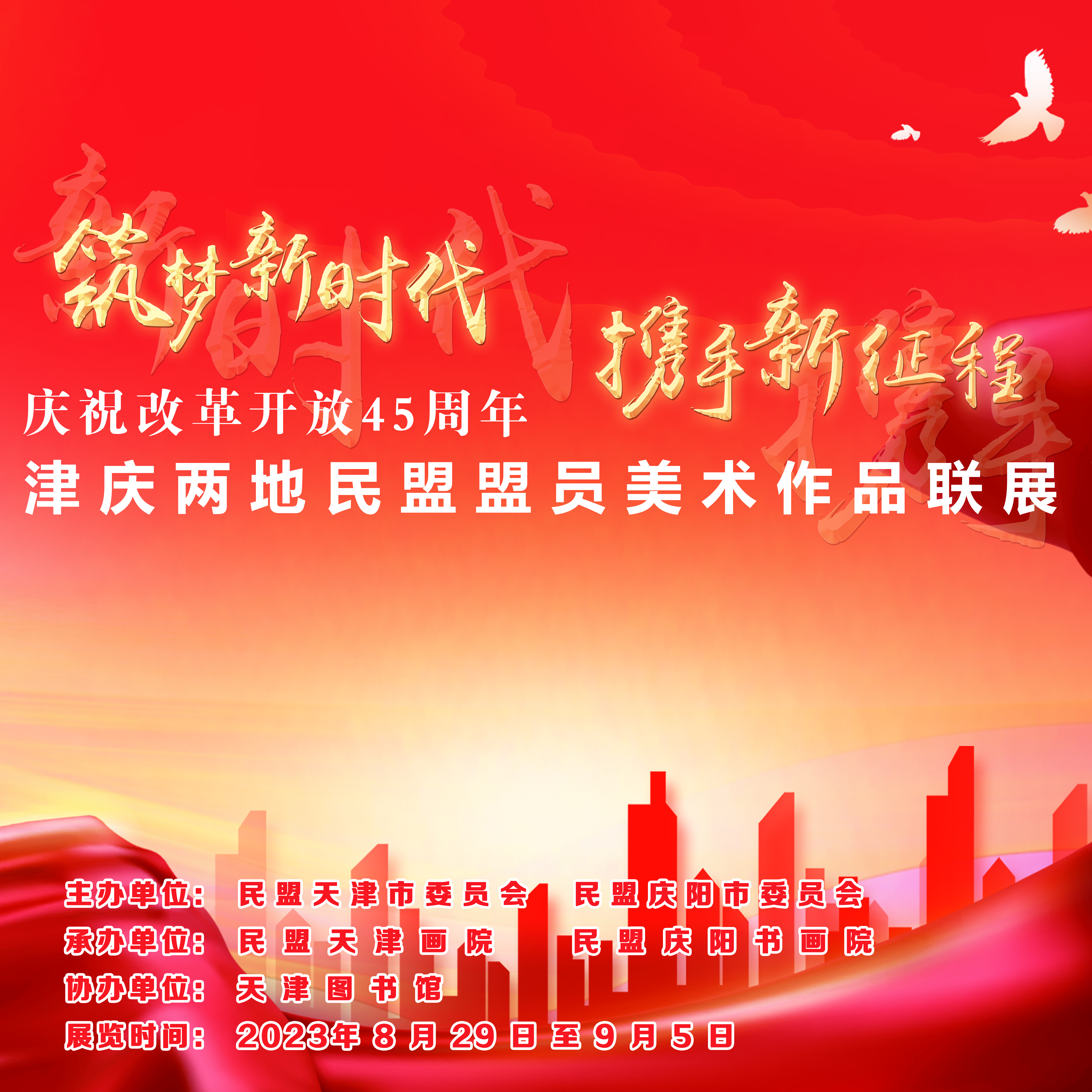 为进一步激发和凝聚广大盟员为全面建设社会主义现代化国家不懈奋斗的干劲和热情,隆重庆祝改革开放45周年,民盟天津市委员会和民盟庆阳市委员会联合策划筹办展览,旨在通过艺术形式,回顾我国改革开放和社会主义现代化建设新时期的实践经验与光辉成果,描绘新时代新征程的恢弘气象和丰富多彩的社会生活,展现新时代十年来天津、庆阳两地民盟组织合作交流、开展东西部协作和对口支援的重大成就以及两地盟员积极投身改革开放伟大实践的精神风貌。