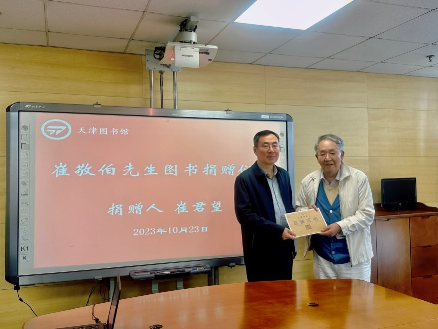 10月23日上午,耄耋之年的崔君望先生在家人的陪同下,专程来到天津,将其父崔敬伯先生的珍贵书籍捐赠给天津图书馆。天津图书馆馆长李培为崔君望先生颁发了捐赠证书,副馆长刘铁接受捐赠。
