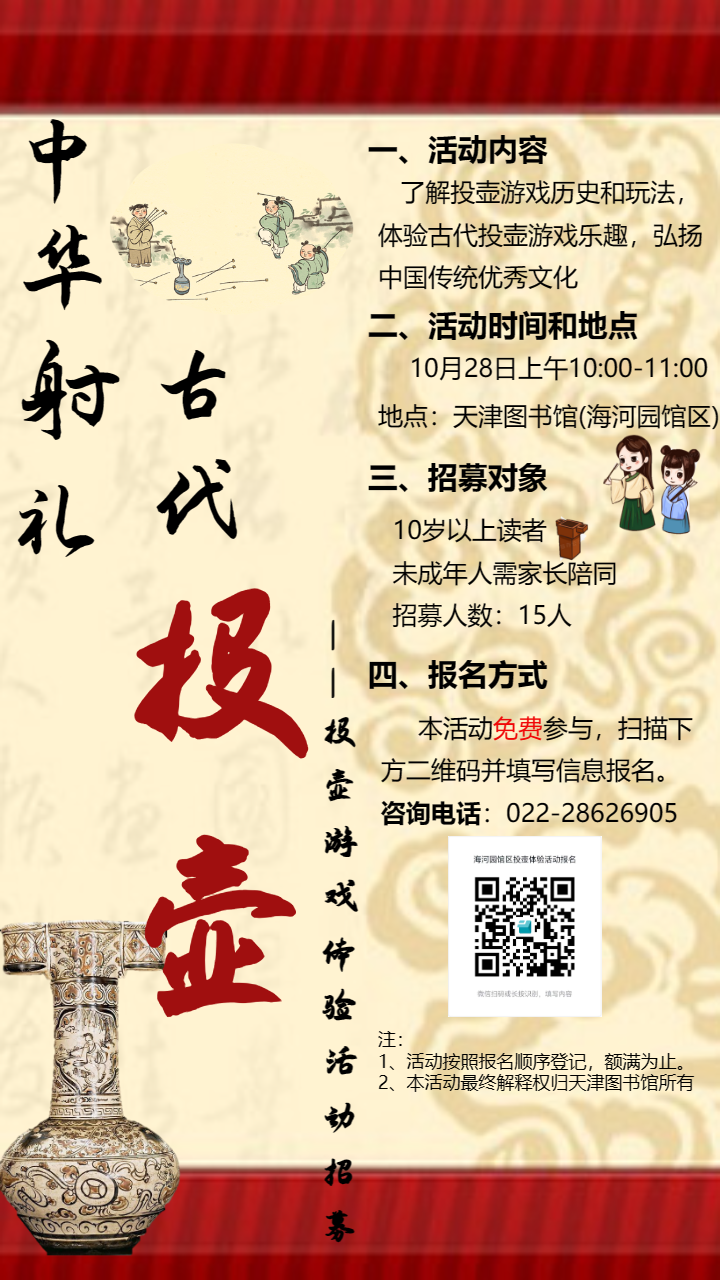 为让读者了解投壶游戏,效仿古人感受投壶的乐趣,在提升身体协调能力的同时,感受中华优秀传统文化的魅力,天津图书馆将开展投壶游戏体验活动,活动详情请见下方海报,欢迎各位读者报名体验!