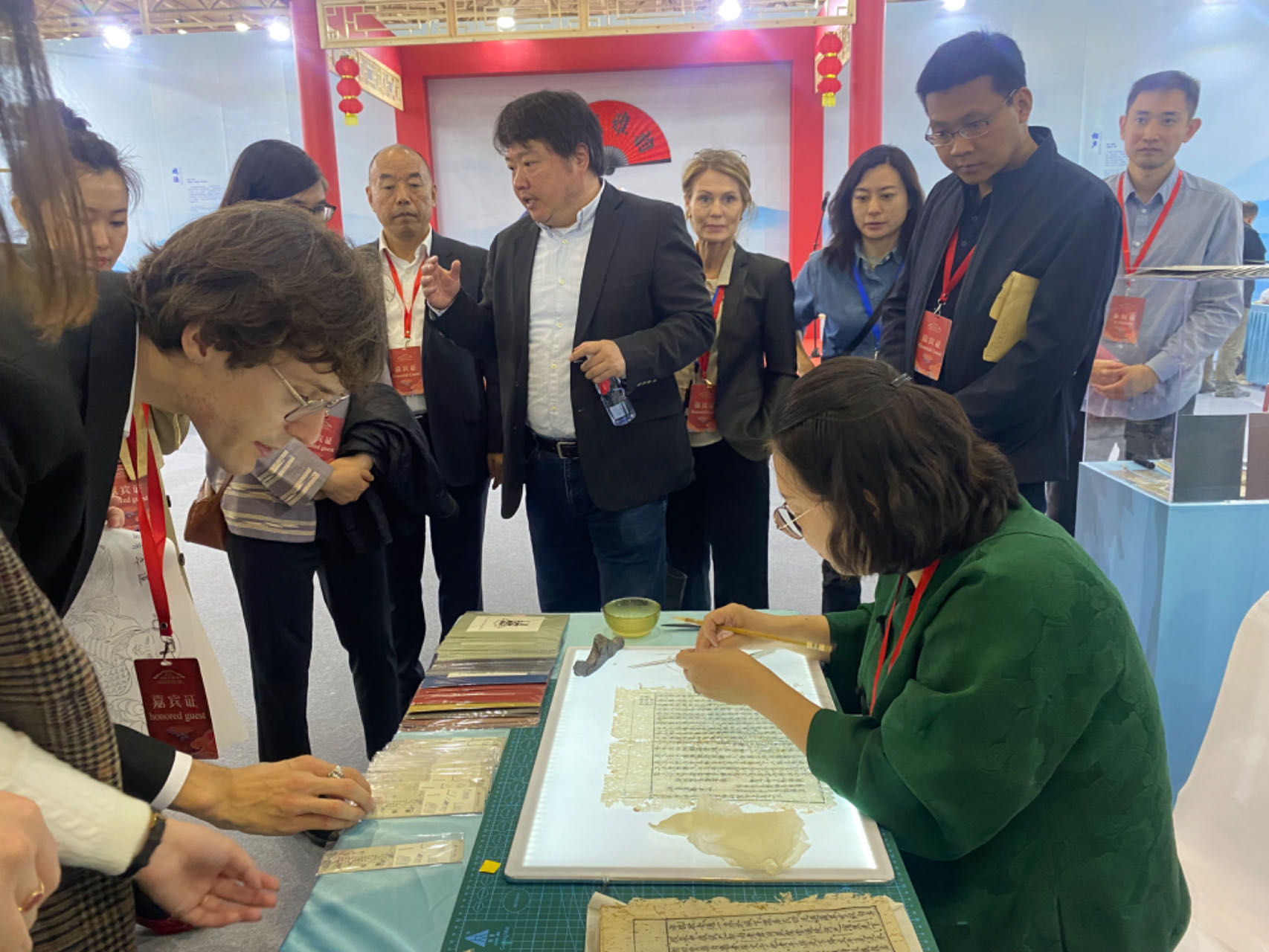 天津图书馆(天津市少年儿童图书馆、天津市古籍保护中心)应邀参展,我馆展位设于中国展区的“津门雅韵”展区。古籍修复师通过现场展示古籍残损书叶修复技法并配合修复技艺讲解与体验等直观方式,向读者多角度展现我馆国家级非遗技艺—装裱修复技艺的精彩。