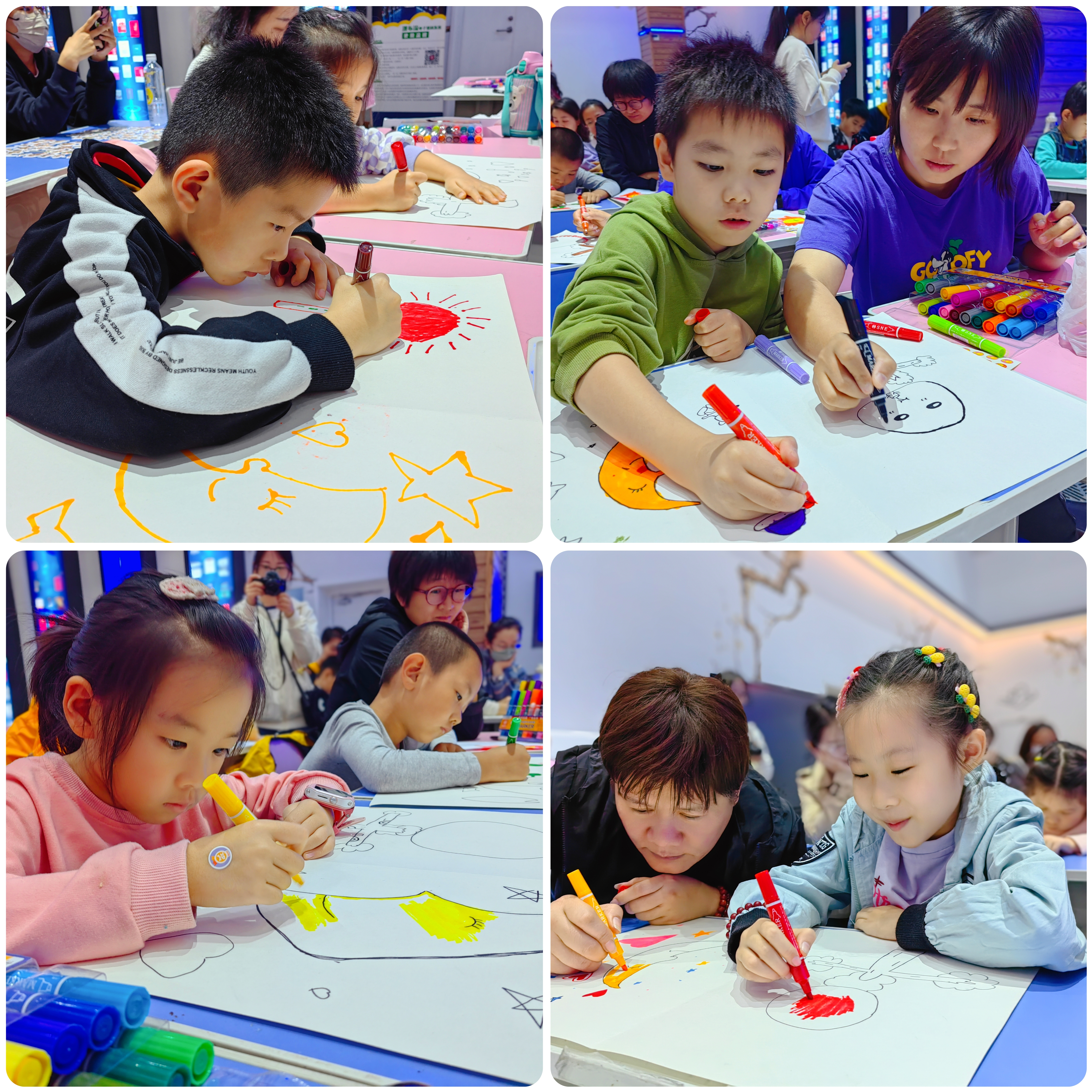 以汉字“早”和“月”为绘画原型,老师指导小读者用简笔画简练、概括、夸张、直观的表现形式,画出一个个丰富多彩的“汉字”。活动过程中,有“严厉型”家长,让小读者独立去完成创作;也有家长会在小读者撒娇卖萌攻势下,在画作上添上自己有力的一笔。大家都十分享受此刻美好的亲子时光。活动选择“早”和“月”两个字,在其中渗透了“一寸光阴一寸金,寸金难买寸光阴”的深刻道理,用幽默诙谐和与众不同的讲解方法教会了读者们要珍惜时间,不负韶华。