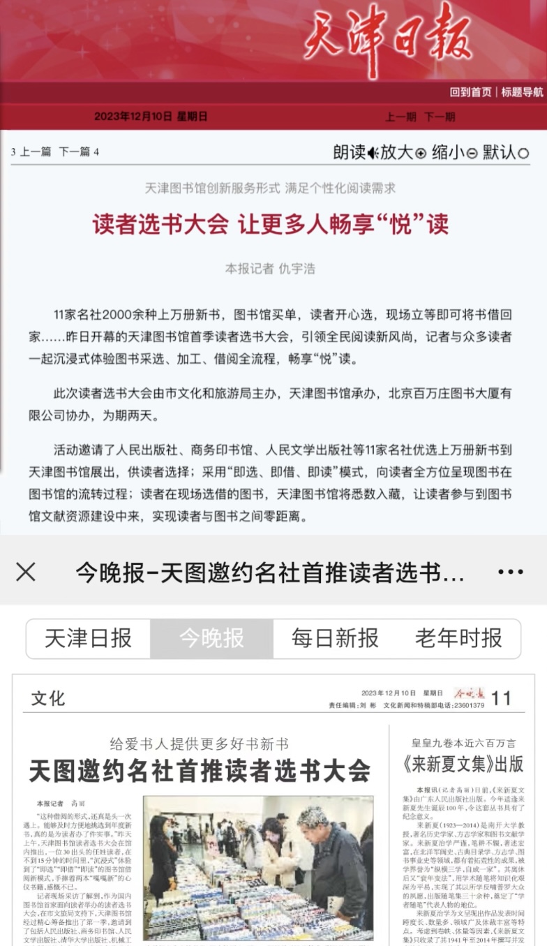 为积极践行即将施行的《天津市全民阅读促进条例》,充分发挥公共图书馆阅读推广主渠道作用,不断满足读者日益增长的美好文化生活需要,12月9日、10日,天津图书馆成功举办了首季“读者选书大会”,受到读者的热烈欢迎,吸引了众多读者参与活动,两天共接待读者近万人次。活动被天津电视台《天津新闻》、《都市报道60分》、《文化关注》栏目以及中国新闻出版广电报、学习强国、天津日报、津云、今晚报等多家主流媒体争相报道,形成了助力全民阅读的良好导向,同时也在微博、抖音、小红书等平台引发了众多网友的热烈讨论和广泛关注,取得了良好的社会反响。