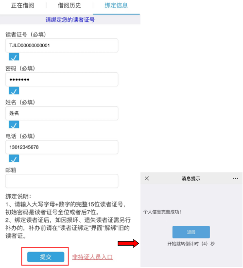1.未绑定过的读者,进入“天津图书馆”服务号,点击“服务”→“读者证绑定”,输入读者证号、密码、姓名、电话及邮箱(其中前四项必填),点击“提交”,提示“个人信息完善成功”即可。