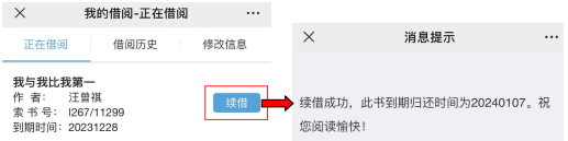 温馨提示:请续借后返回“服务”→“我的借阅”→“正在借阅”,查看确认书刊到期时间。
