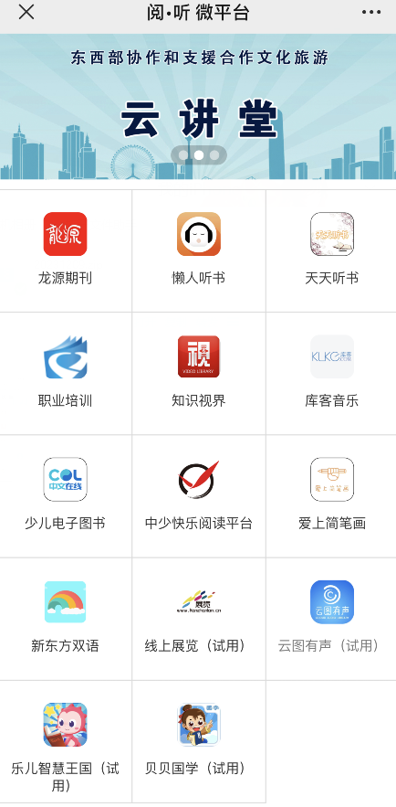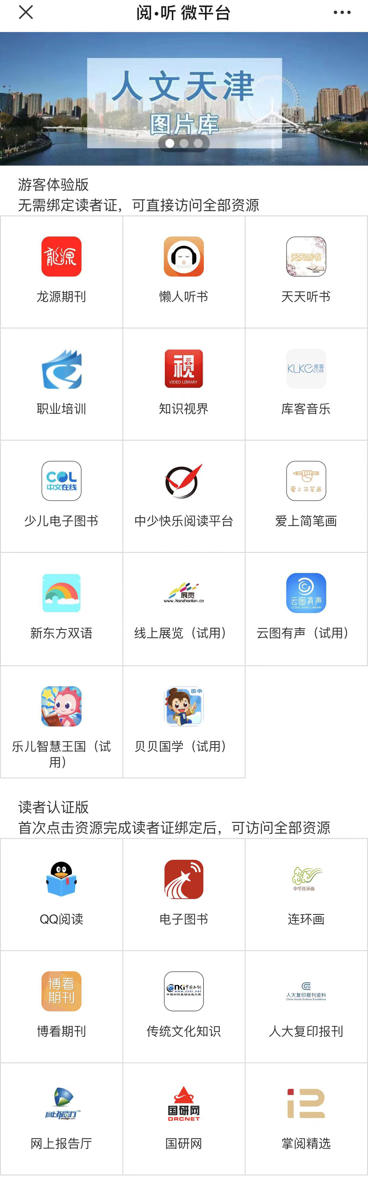 进入“天津图书馆速报”订阅号,点击“阅·听”,无需绑定读者证,可直接浏览与服务号游客体验版相同的数字资源。