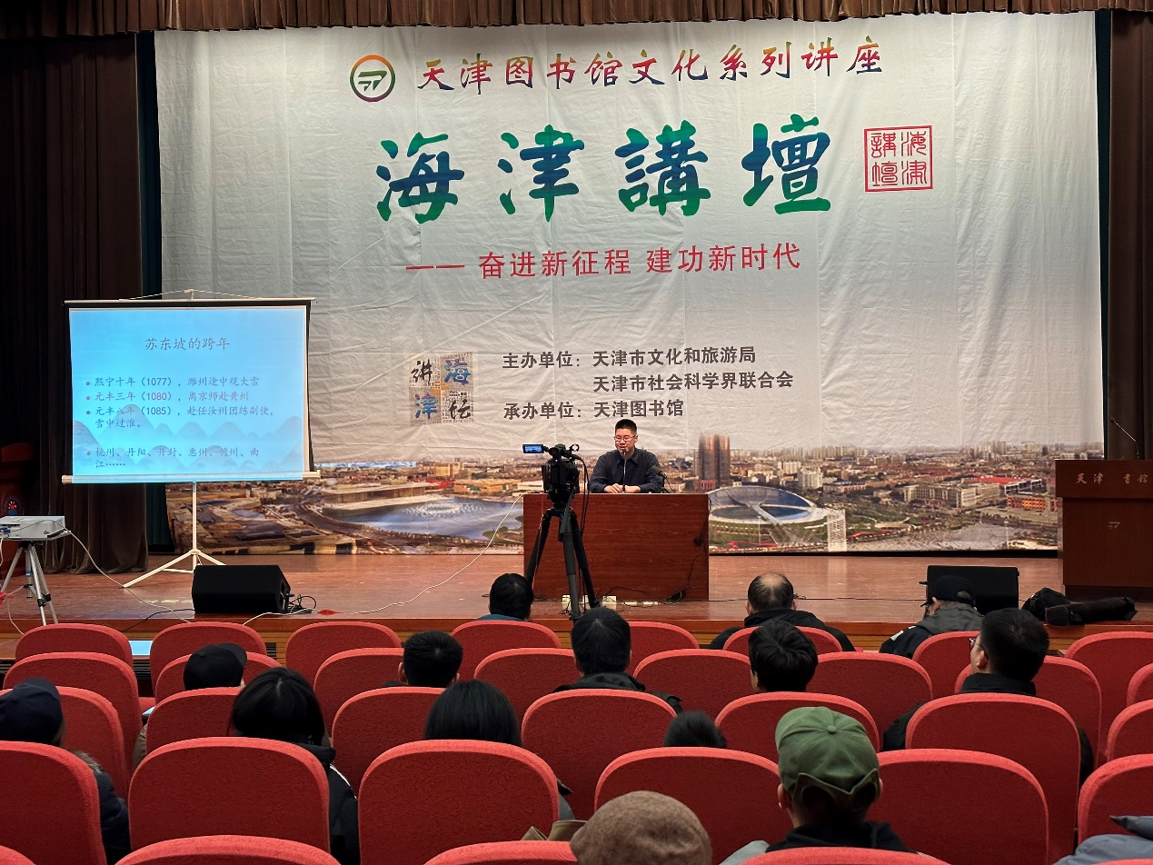 “奋进新征程 建功新时代”——《海津讲坛》第526期于2023年12月31日上午9:30在天津图书馆复康路馆二楼报告厅如期举行。本场讲座由天津市文化和旅游局、天津市社会科学界联合会主办,天津图书馆承办。南开大学文学院副教授张昊苏老师应邀担任本次讲座的主讲嘉宾,为到场读者讲述《雪泥鸿爪,飞向江湖——漫谈苏东坡的人生境界》。