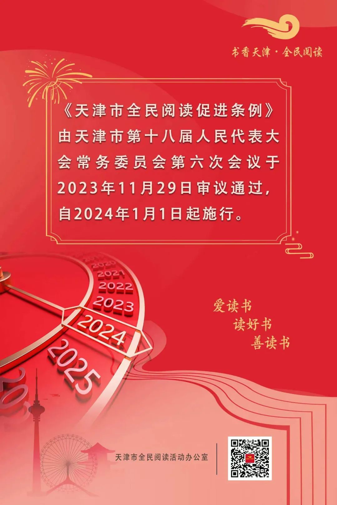 《天津市全民阅读促进条例》自2024年1月1日起施行,以地方立法助力书香天津建设进入规范化、法治化轨道。一城风华,满城书香。