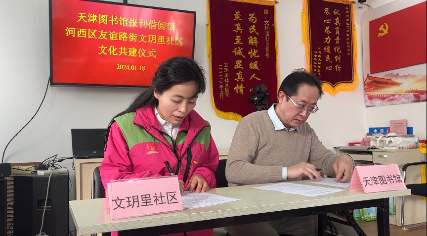 天津图书馆副馆长张纳新介绍了图书馆丰富的馆藏资源、文化使命、和文玥里社区的合作优势及良好前景。双方在友好氛围中签订协议。