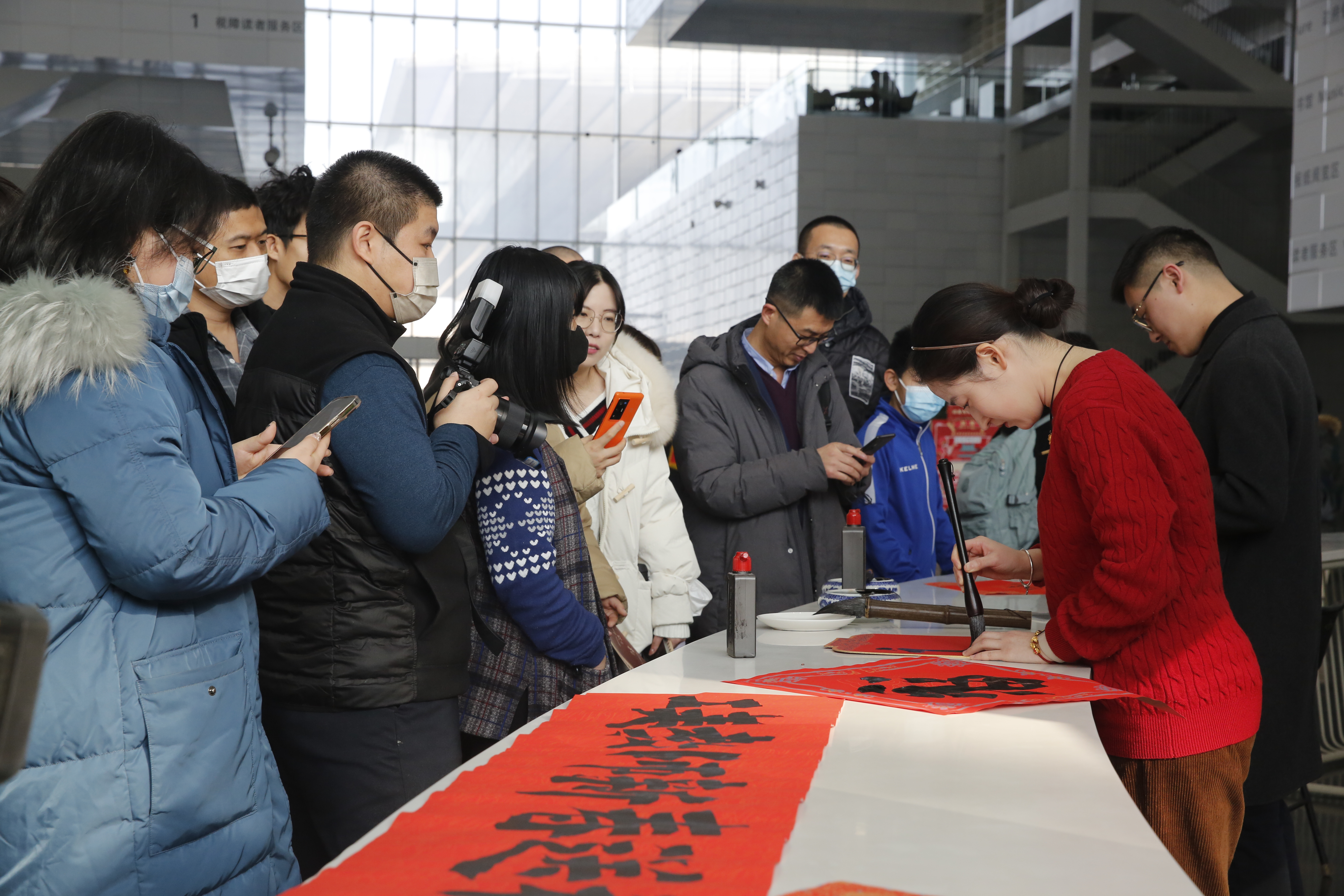 活动现场,工艺美术职业学院教师挥毫泼墨,书写新春福字赠送读者,为即将到来的甲辰龙年增添欢乐祥和、喜庆热烈的节日氛围。