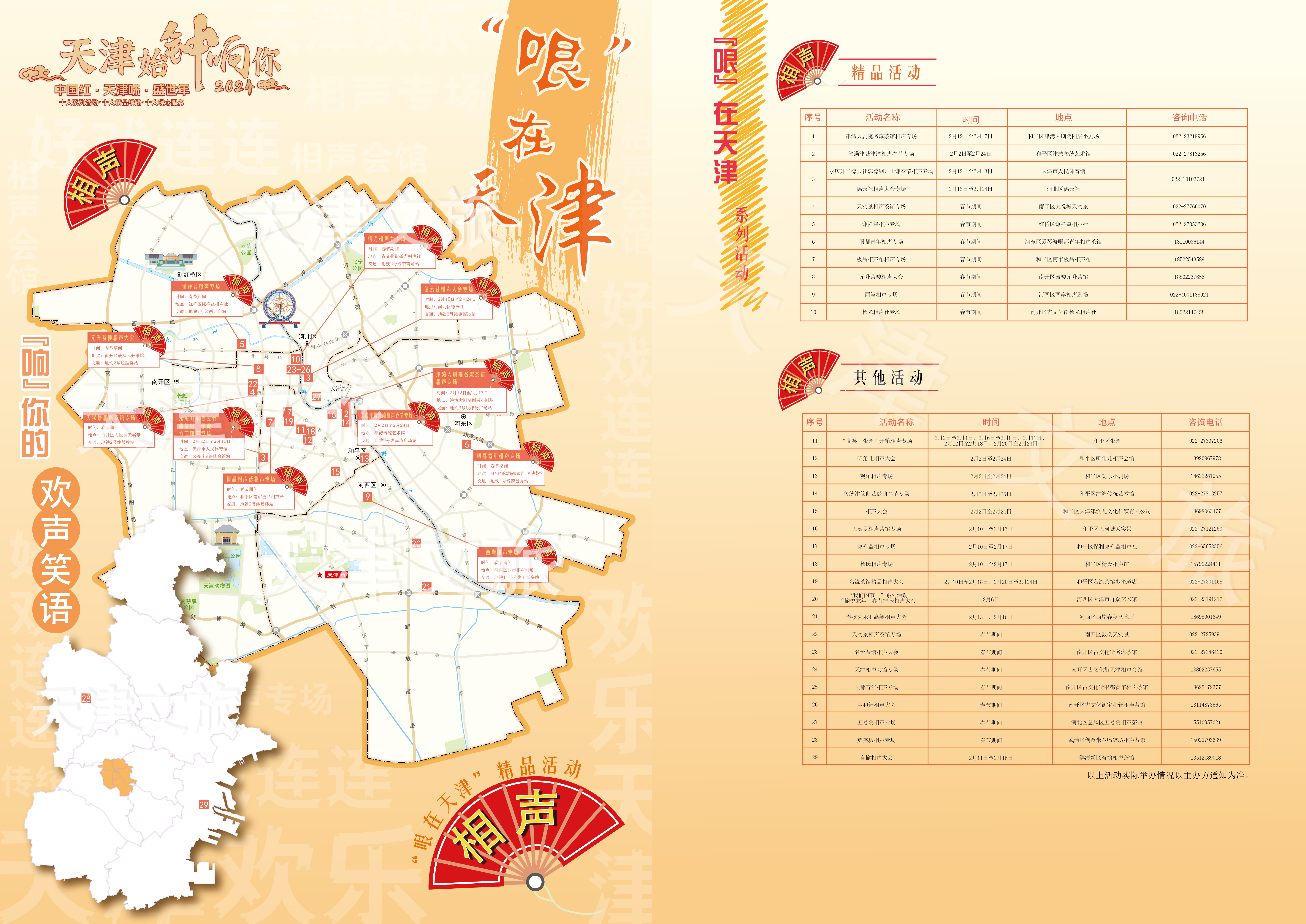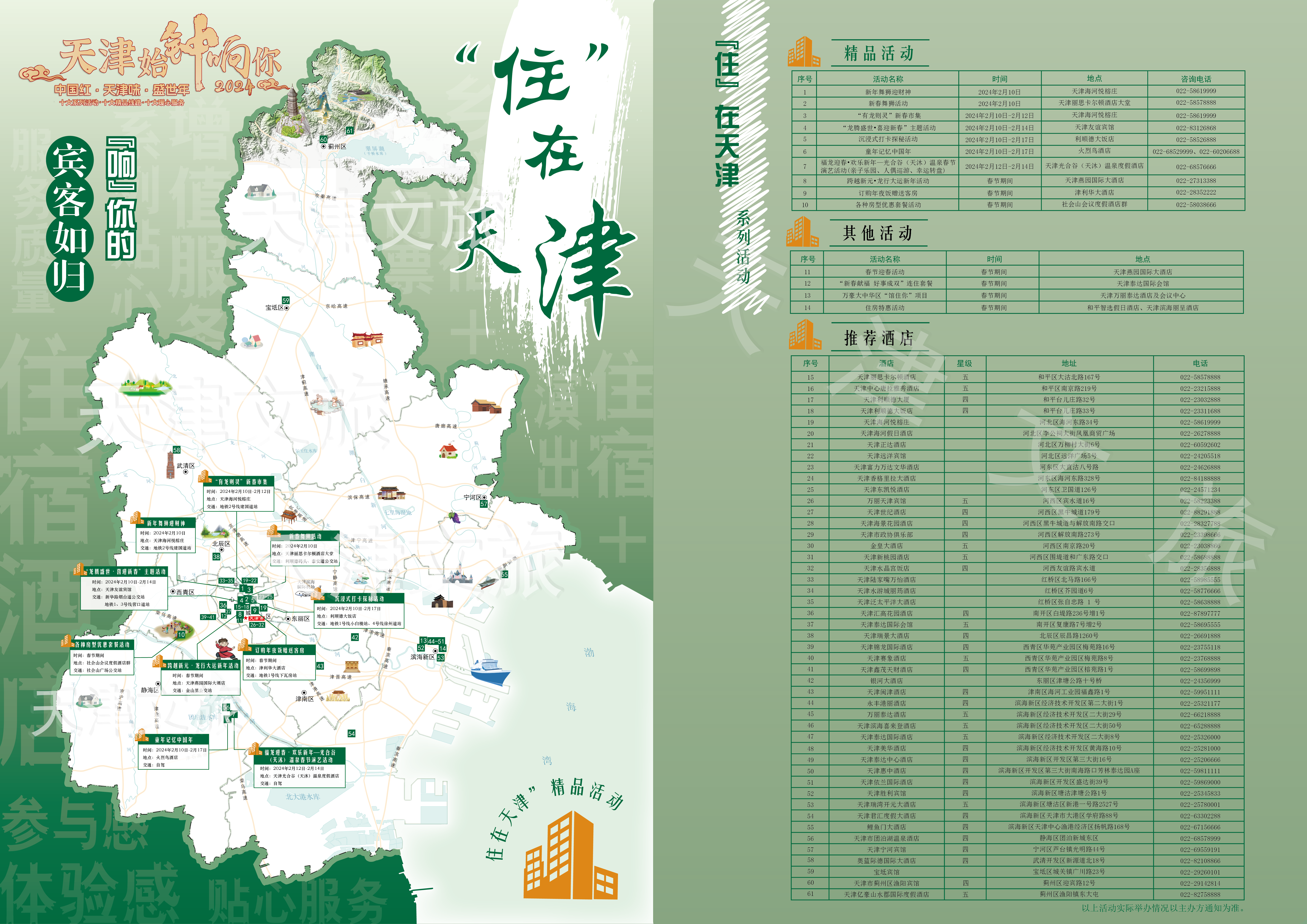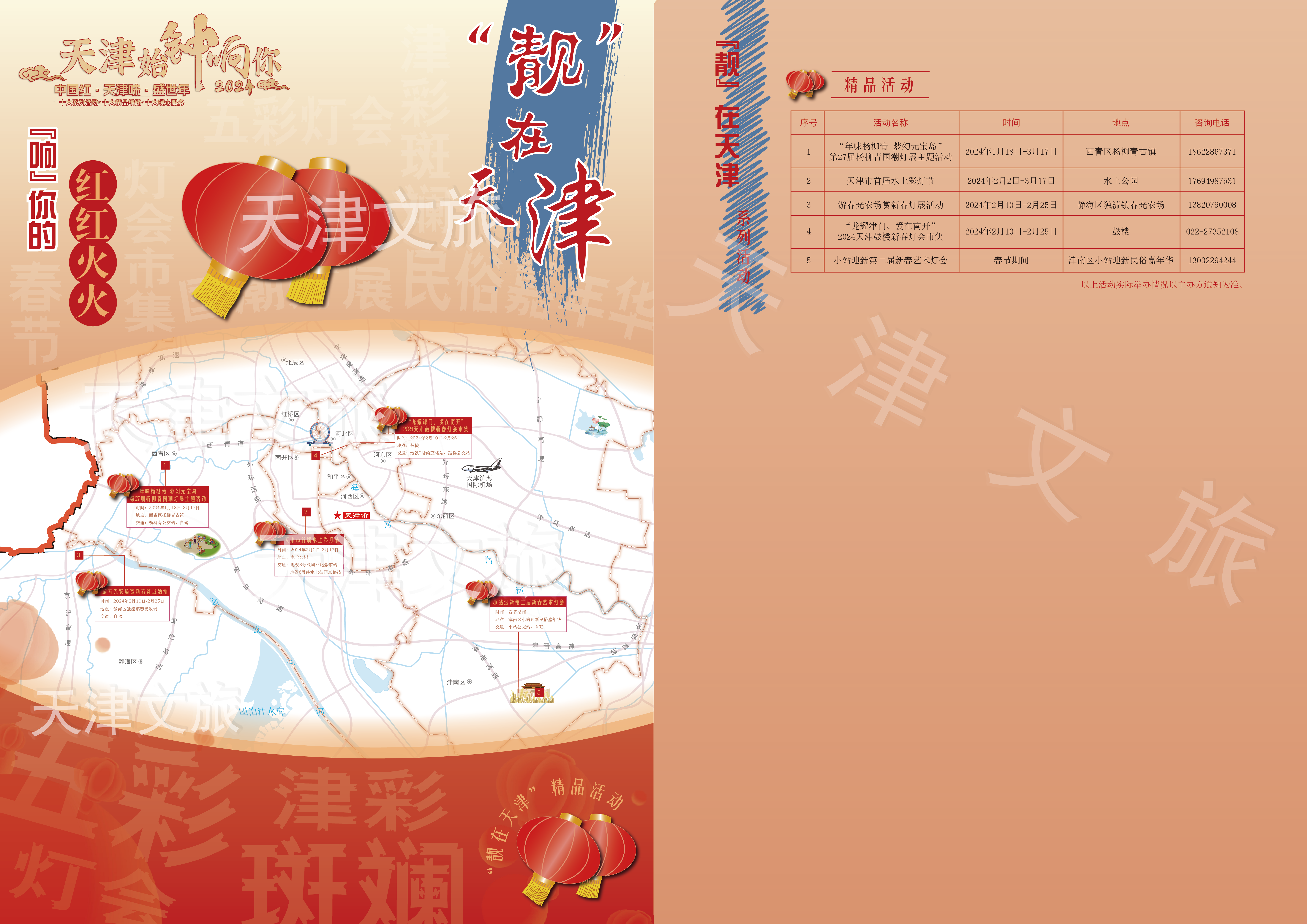 为了方便大家的选择和出游,天津市文化和旅游局特别推出了天津文旅春节十大系列活动图谱,以“吃”在天津、“玩”在天津、“嗨”在天津、“乡”在天津、“忆”在天津、“购”在天津、“哏”在天津、“靓”在天津、“夜”在天津、“住”在天津等十大系列活动为索引,运用可视化的方式标示文旅活动的具体点位,实现“吃住行游购娱”全要素融入,全力打造天津文旅新品牌和新场景,促使天津春节文旅市场热起来、文旅商消费旺起来。