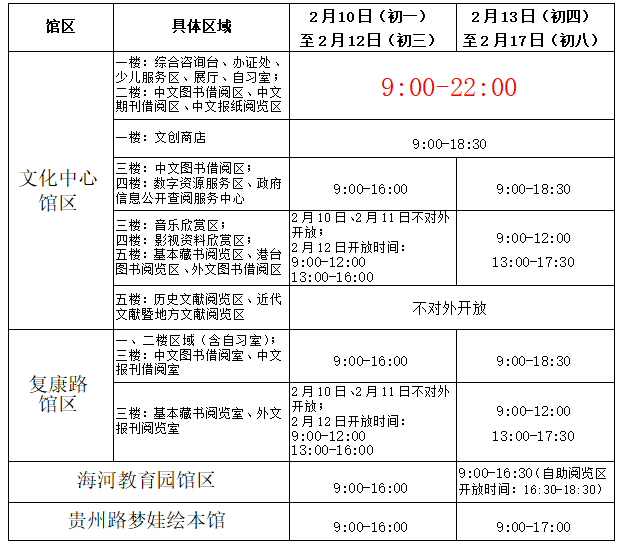 2月9日(除夕)四个馆区(含自习室)开放时间为: 9:00-16:00