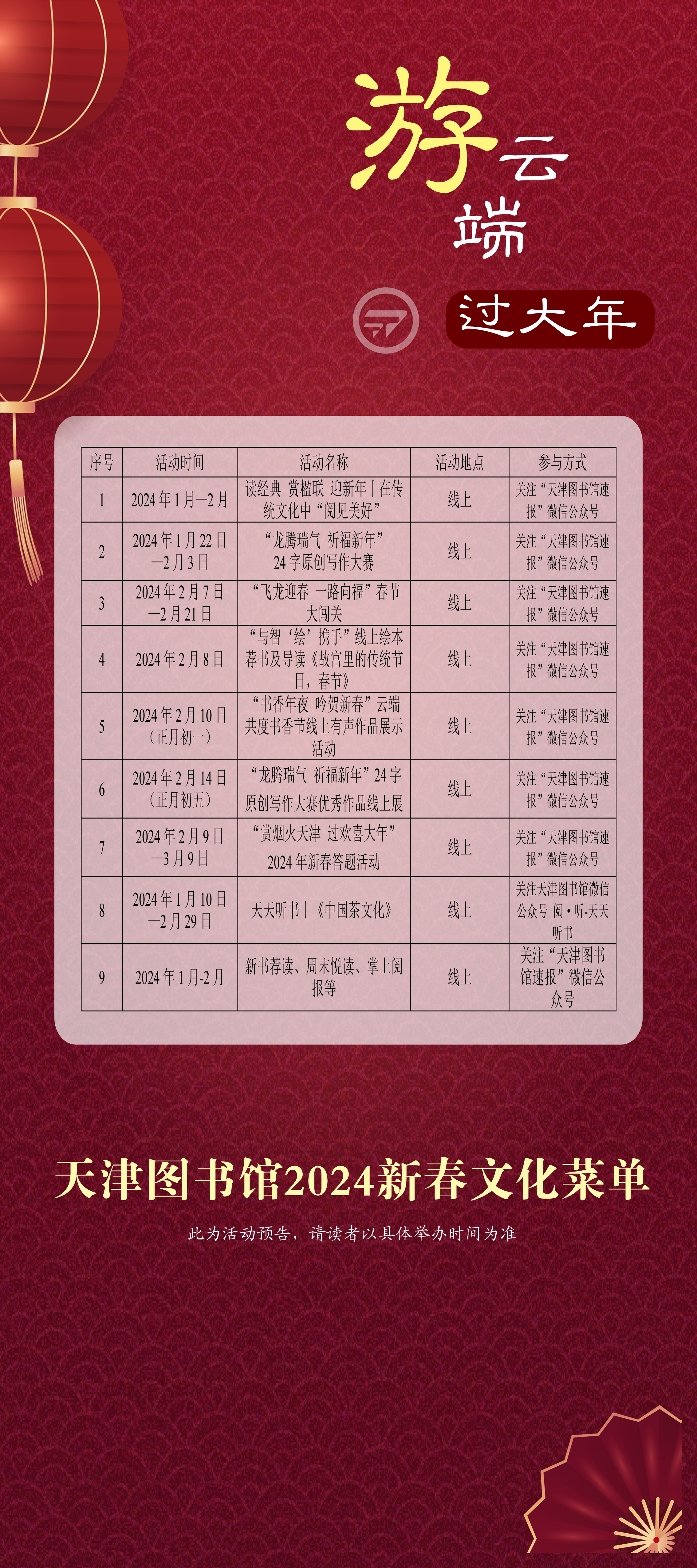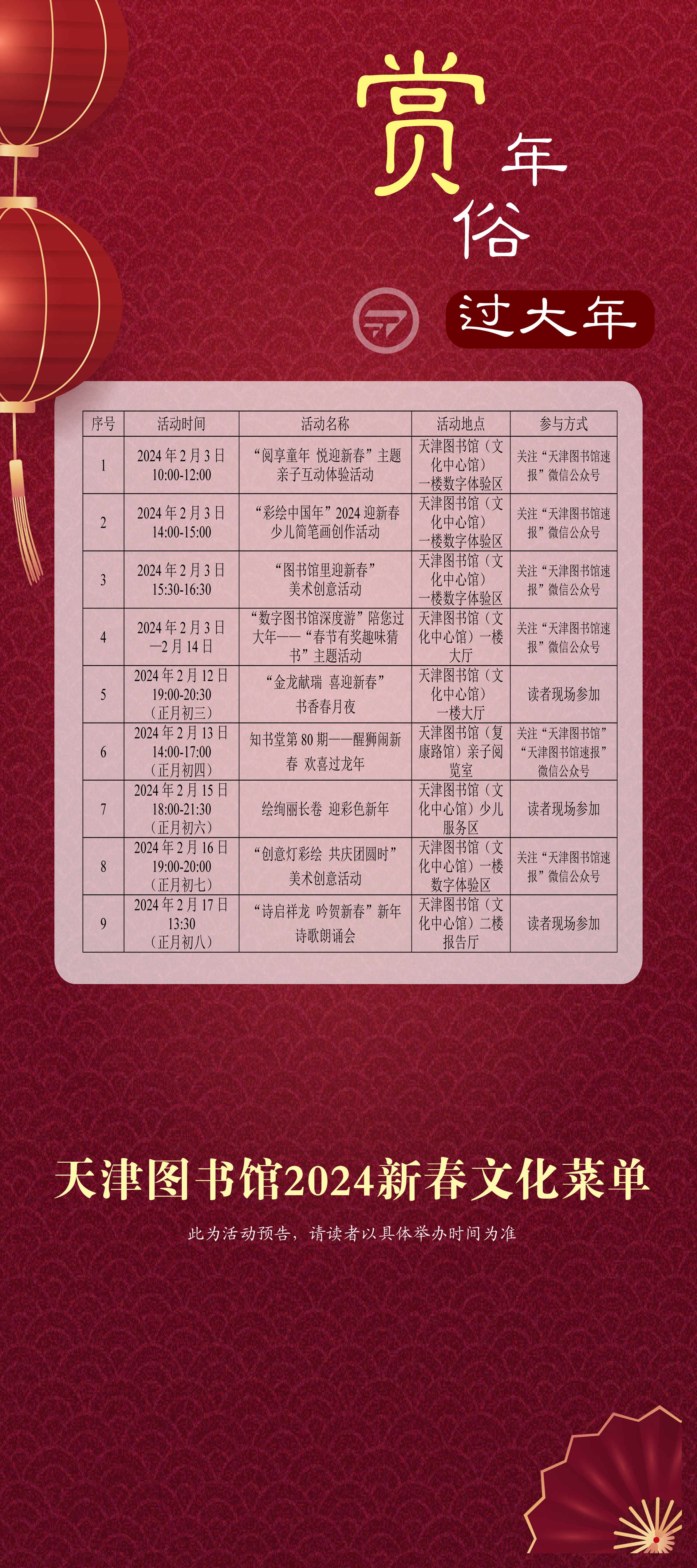 2024年春节期间,天津图书馆开馆时间安排如下: