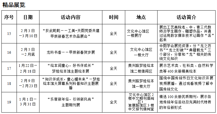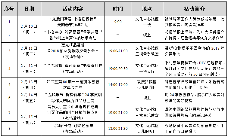 大年初一(2月10日),热气腾腾的“开胃菜”。上午9:00,“龙腾闹新春 书香送祝福”天图春节拜年活动喜气洋洋话新春:馆领导将率工作人员在文化中心馆区一楼大厅恭候第一批到馆读者,并致以新春问候;与此同时,“书香年夜 吟贺新春”活动将在线上开展,云端展示精品,为广大读者推介古诗词、红色经典等优秀文学作品。