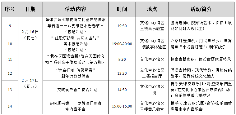 大年初八(2月17日),天图好多“拿手菜”。文化中心馆区精彩活动带您收官大年假期:9:30,“我在天图读古籍•我在天图修文物”系列亲子体验活动(第五期),带您探索古籍奥秘,体验古籍修复技艺;13:30,“诗启祥龙 吟贺新春”新年诗歌朗诵会精彩加乘,诵读古诗词、现代诗歌,讲述传统故事,感受传统文化魅力;14:30,“交响润书香”快闪活动在一楼亮相,携手天津交响乐团•奇迹弦乐四重奏,在文化中心馆区开展快闪活动,让音乐与书香完美结合;15:00至16:00,“交响润书香——龙耀津门新春室内音乐会”在三楼音乐教室如期举行,新春的序曲即将在天图奏响。