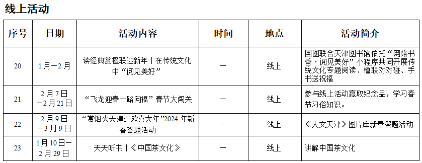 恰逢新岁喜迎春,图书馆里过大年。天津图书馆2月10日至2月17日(正月初一至初八)开馆不打烊,文化中心馆区更是延时开放至22:00。过年来天图,系列精彩活动满载拳拳诚意,供您飨盛宴,加送文化餐,陪您一起书香过大年!