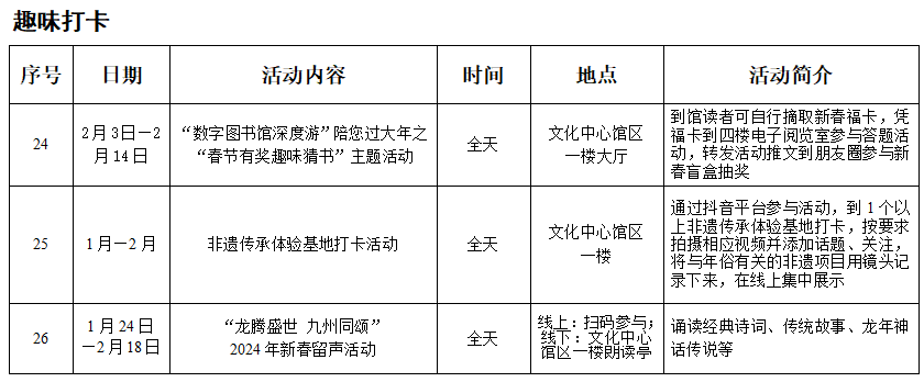 大年初三(2月12日),书香春月夜里的“甜点”。19:00至20:30,文化中心馆区一楼大厅将迎来第二个夜场活动,“金龙献瑞 喜迎新春”将在新春之夜巧寄新年期盼,通过书写新年祝福寄语、DIY红包拓印、猜灯谜等形式,设置文化产品刮刮乐,参加三个环节活动的前50名读者,可以刮奖抽取精美好礼哦。