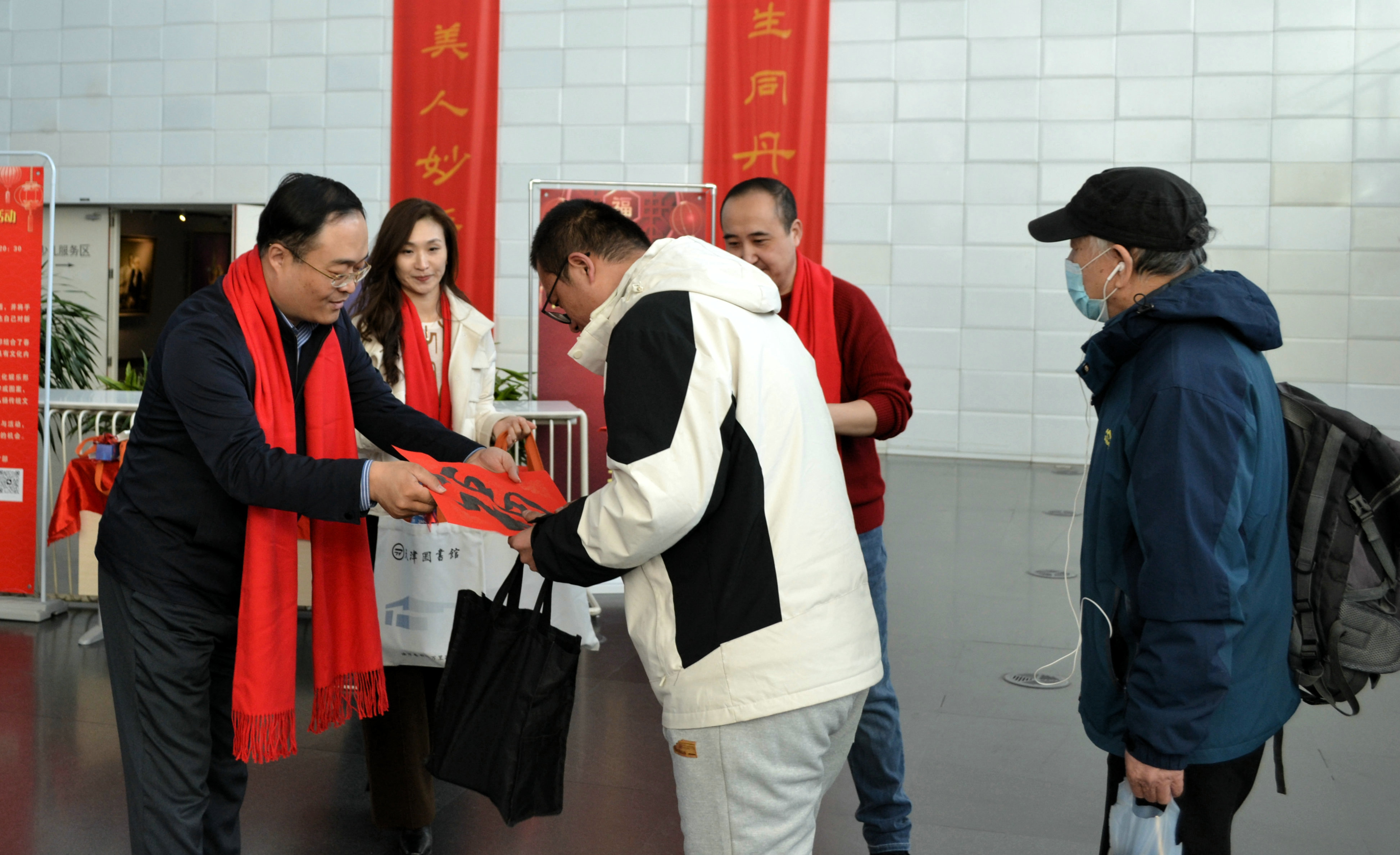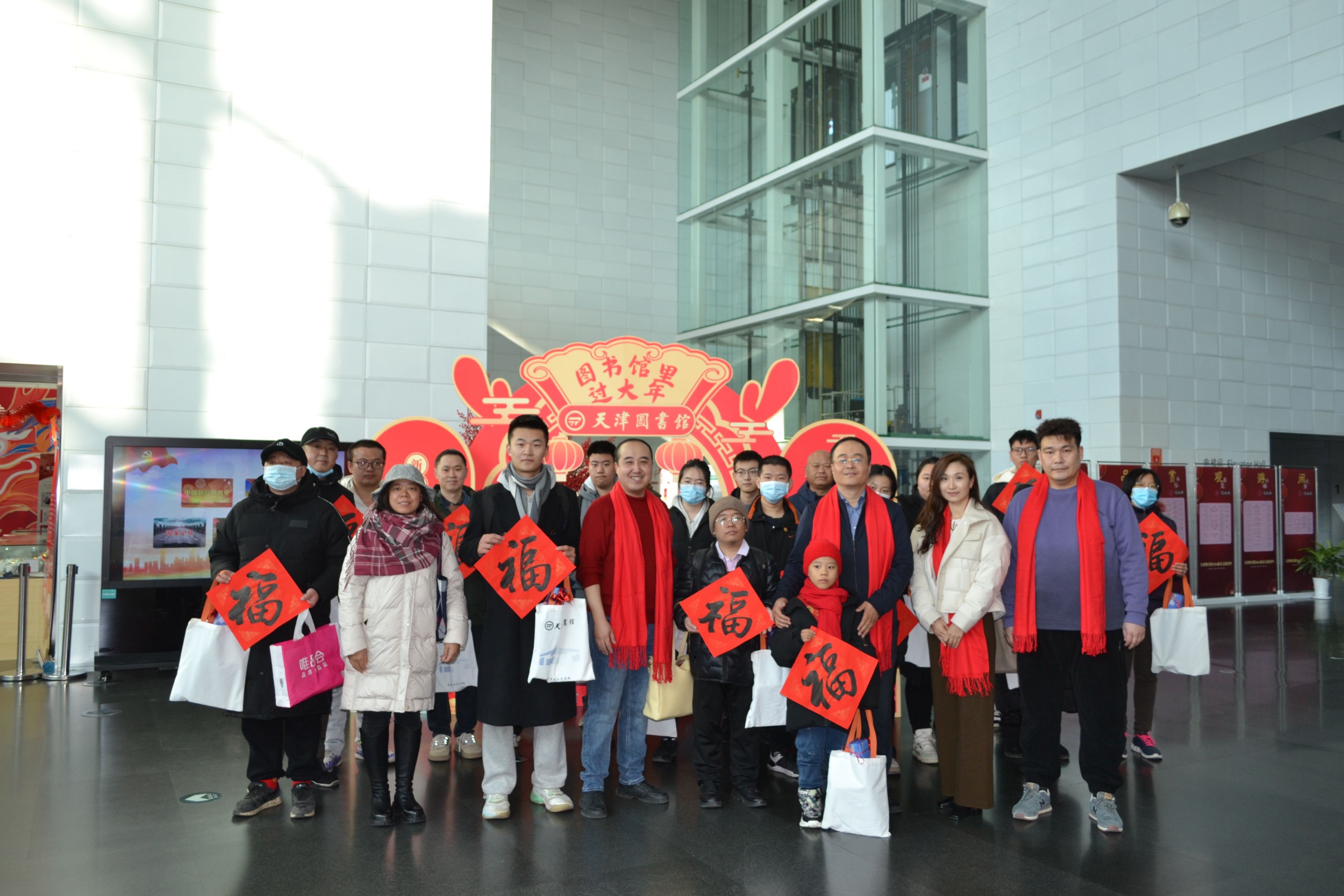 龙腾闹新春,书香送祝福。大年初一早上9:00,天津图书馆党委书记李冠龙率工作人员,在文化中心馆区一楼大厅恭候龙年第一批到馆读者,向读者拜年,致以新春的问候,并赠送天图精心准备的新年文化大礼包。